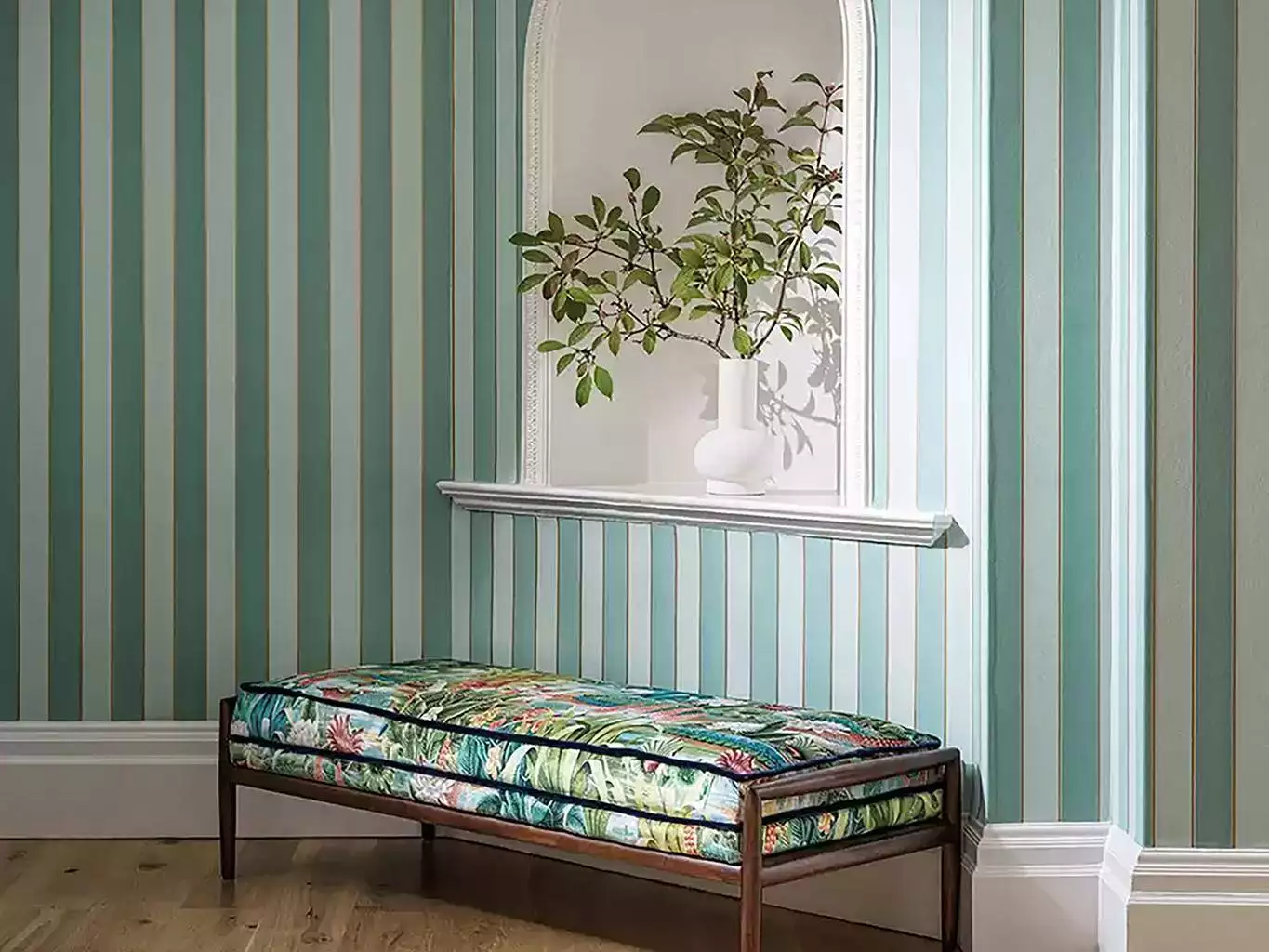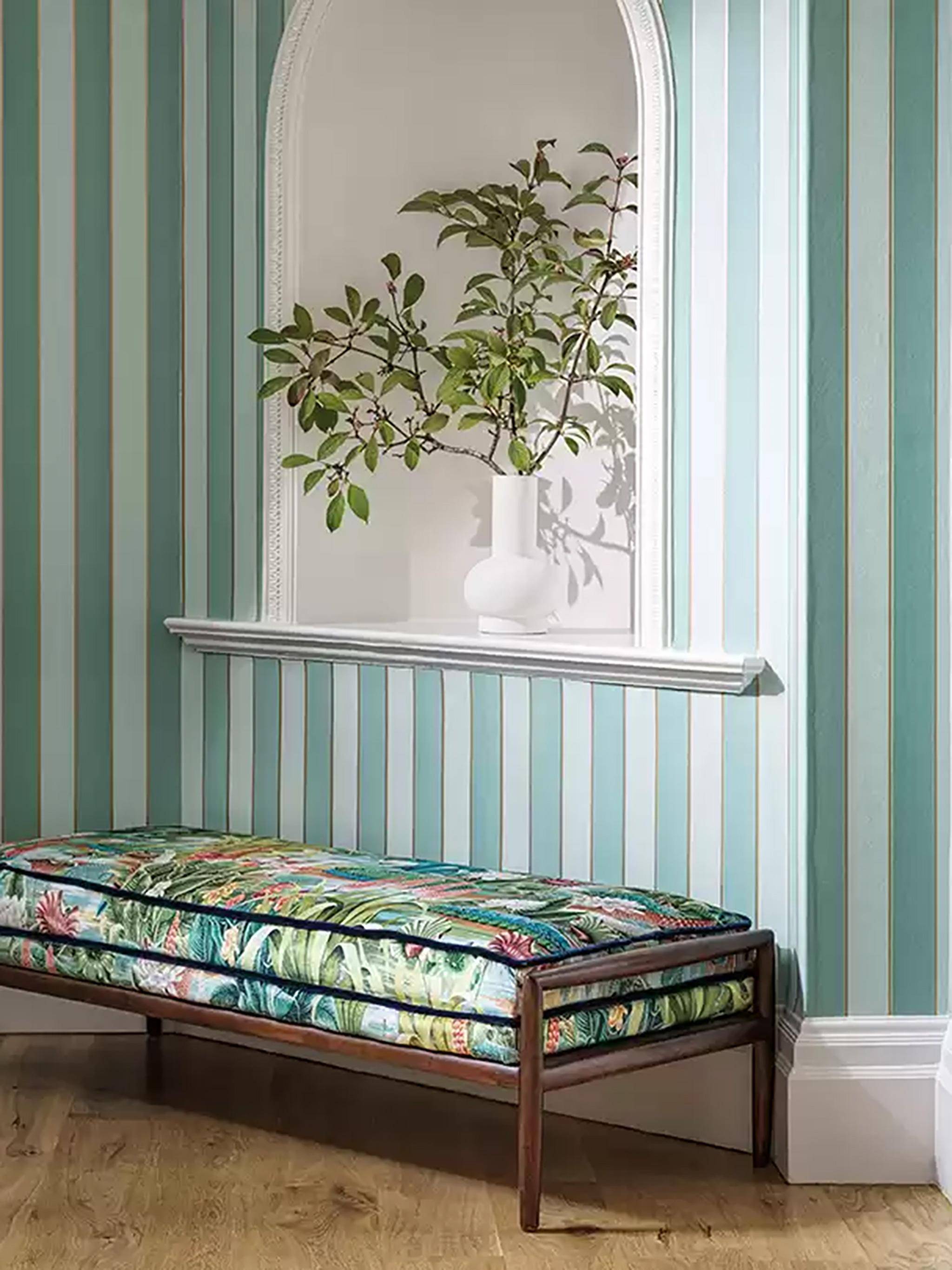 Regency Stripe von Osborne & Little - die moderne Interpretation klassischer Streifentapeten. Das Design kombiniert samtigen Flock mit einem feinen Nadelstreifen und verleiht Räumen dadurch Struktur und Tiefe. Die klare vertikale Linienführung streckt Wände optisch und wirkt elegant und zeitlos zugleich. In soften Pastells fügt sich Regency Stripe mühelos in klassische und moderne Interieurs ein. Ideal für Flure, Esszimmer oder stilvolle Wohnbereiche mit Anspruch auf dezente Raffinesse.