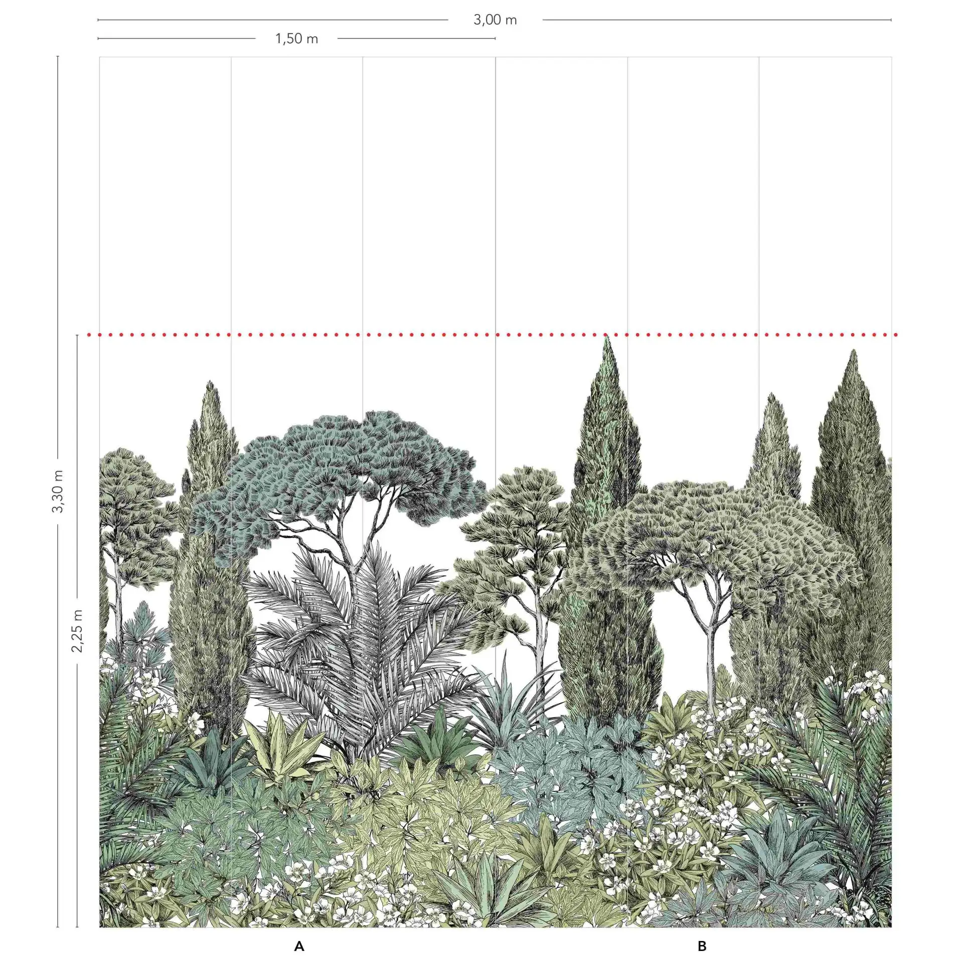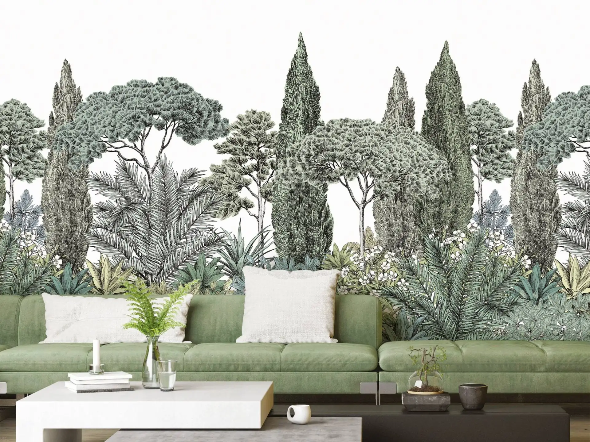Gezeichnetes Panorama-Wandbild mit mediterranen Baummotiven.
