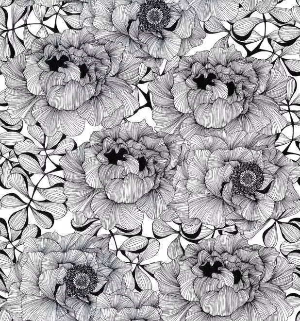 Die Tapete Rose Flower, Silver zeigt ein dynamisches Spiel aus floralen Linienstrukturen in Schwarz und Silber auf weißem Grund. Die üppigen Rosen wirken grafisch und expressiv zugleich und schaffen eine starke visuelle Präsenz mit kunstvoller Tiefe.