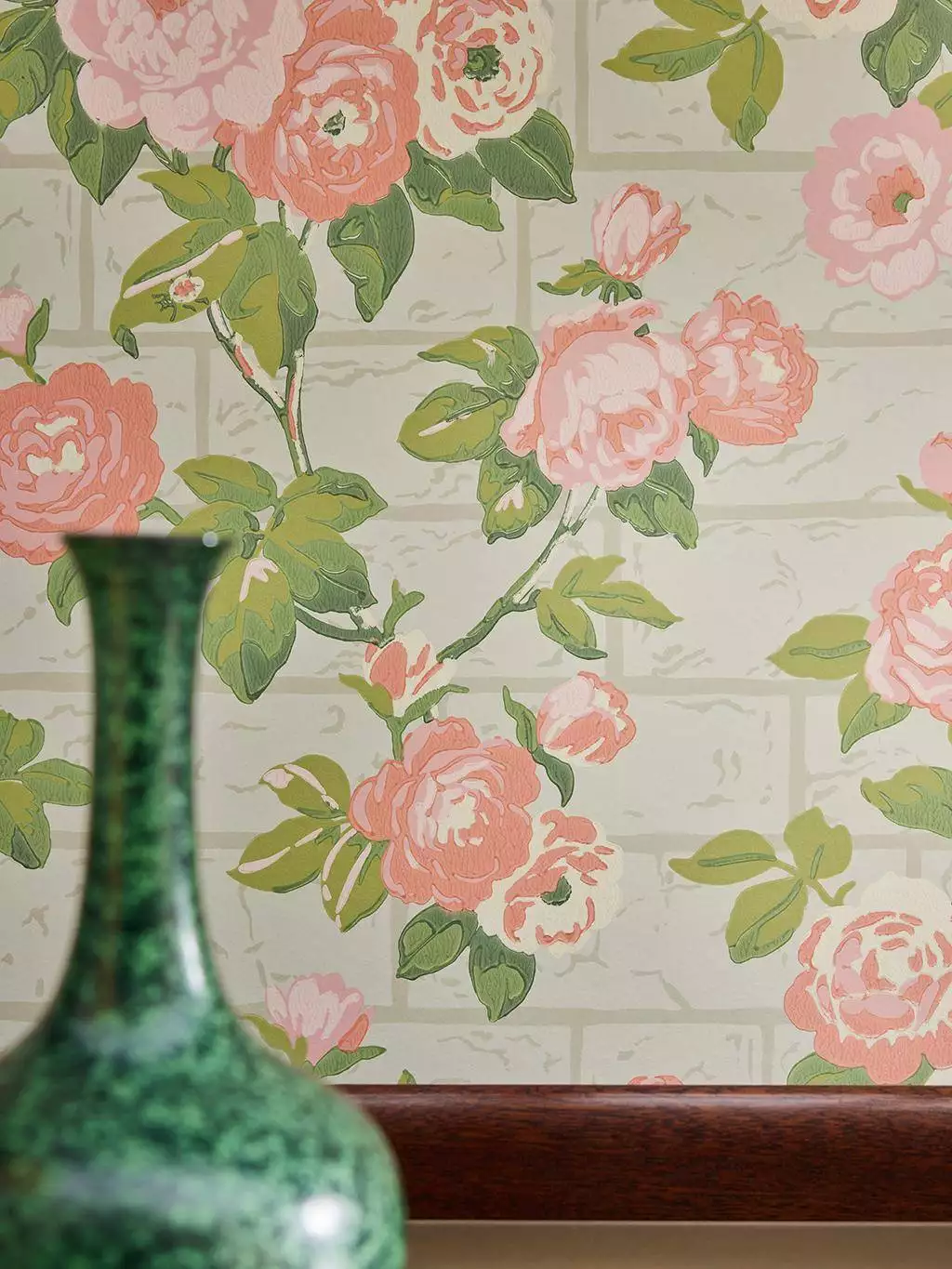 Nach dem Vorbild von Mottisfont Abbey in Hampshire zeigt die bezaubernde Tapete Rose Garden von Little Greene einen alten Rosengarten, eingefasst von alten Mauern. Hier wachsen historische Rosen dicht und frei zugleich, ungezähmt, fast ein bisschen übermütig. Genau so wirkt das Design: üppige Blüten, die sich locker über eine helle Steinstruktur legen. Zarte Rosé- und Apricottöne treffen auf frisches Grün und einen weichen, sandigen Grund. Alles wirkt luftig, hell, fast sonnendurchzogen. Ein Rosengarten voller Charakter und Lebensfreude. Und genau deshalb bleibt er im Kopf. Erhältlich in den Farbgebungen (hier) Green Stone, Puck, French Grey, Portland Stone und Slaked Lime. Sprechen Sie uns gerne an.