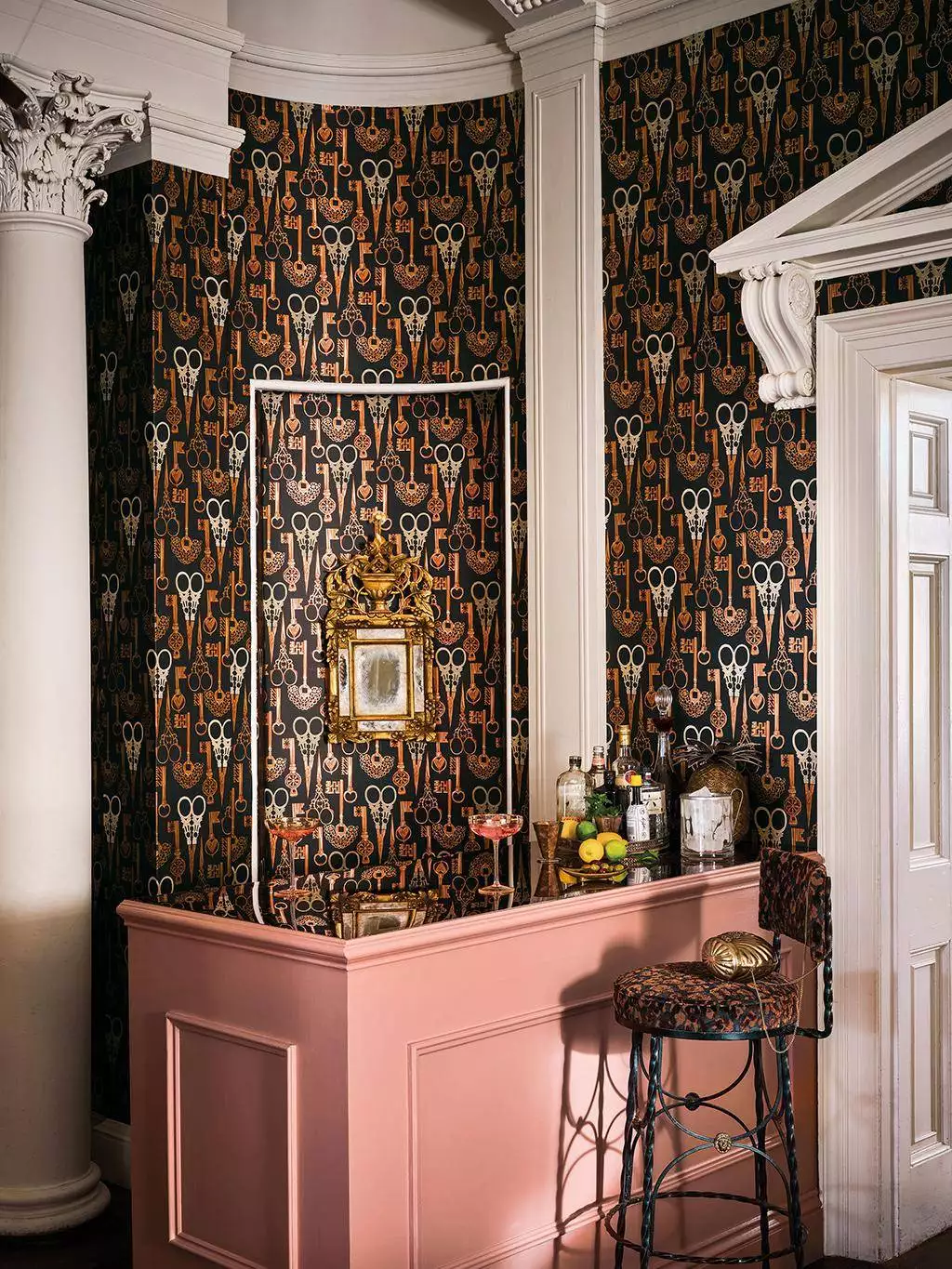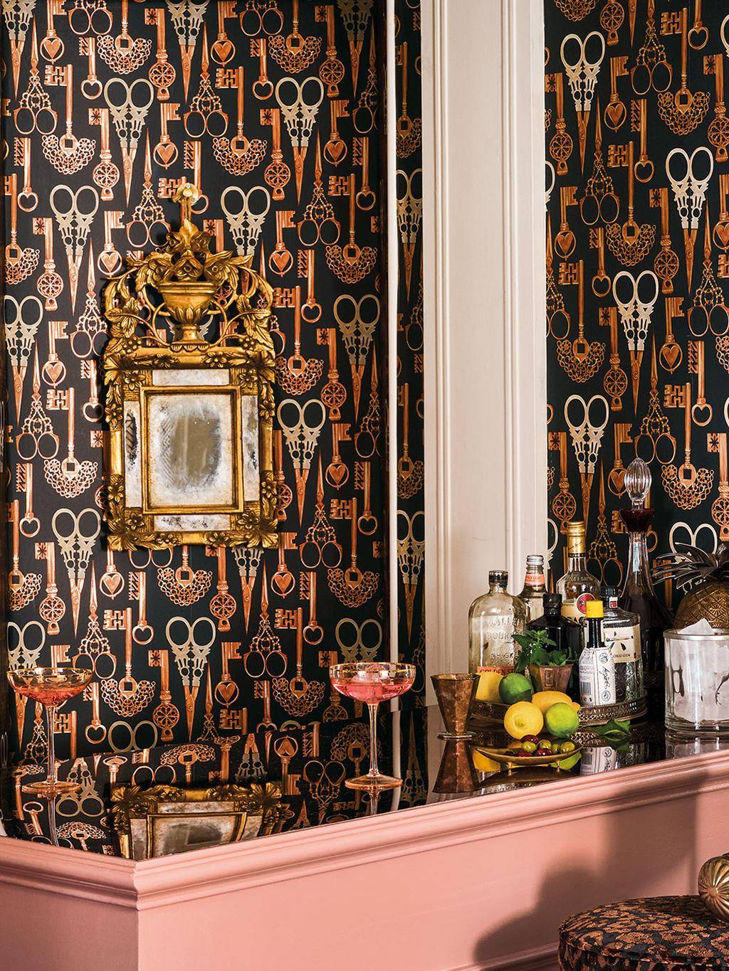 Auf dunklem, tiefgründigem Fond offenbart die Tapete Roxanne aus der Kollektion Temperley London x Romo ein faszinierendes Spiel aus Symbolen – feine Schlüssel und verzierte Scheren, wie Geheimnisse vergangener Zeiten, die im Metallic-Schimmer von Gold und Kupfer aufleuchten. Das Muster vereint auf moderne Weise Art-Deco-Flair mit einem Hauch Boho-Poesie. Eine dekorative Tapete, die Sinne inspiriert und den Raum leise mit Finesse erfüllt.