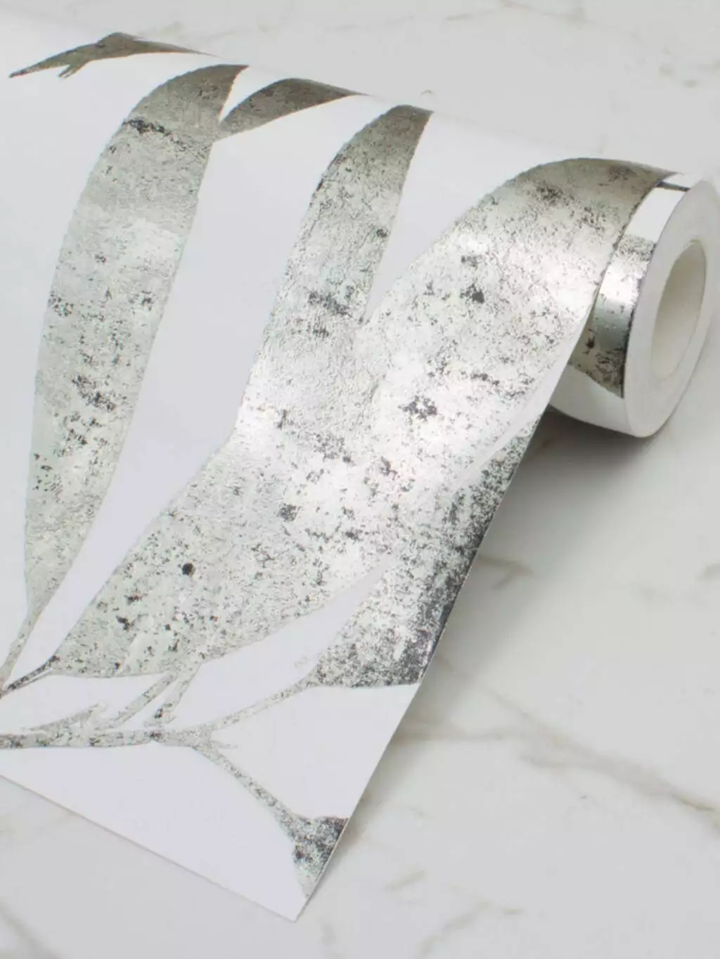 Das sich wiederholende Muster füllt den Raum mit sich schlängelnden Zweigen, wobei die metallische Oberfläche der Blätter das Licht einfängt und in den Raum zurückwirft. Gedruckt auf einer haltbaren, FSC-zertifizierten Vliestapete.