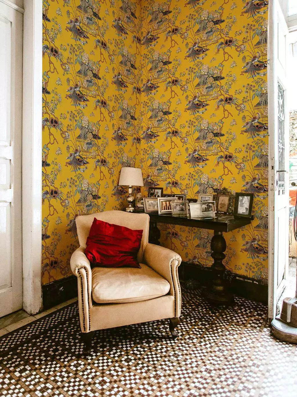Die Tapete Sacred Pheasants Amber erstrahlt in einem prächtigen Gelbton, der mit exotischen Motiven verziert ist. Majestätische Fasane, eingebettet in detailreich gestaltete Blumenarrangements und kunstvolle Pagoden, laden zu einer Reise in die fernöstliche Welt ein. Die opulente Darstellung erinnert an traditionelle Chinoiserie und verleiht jedem Raum eine zeitlose Eleganz. Perfekt für Wohnbereiche, in denen ein Hauch von Extravaganz und Wärme erwünscht ist. Kombiniert mit dunklen Holzmöbeln oder dekorativen Elementen wird diese Tapete zum Highlight jeder Einrichtung.