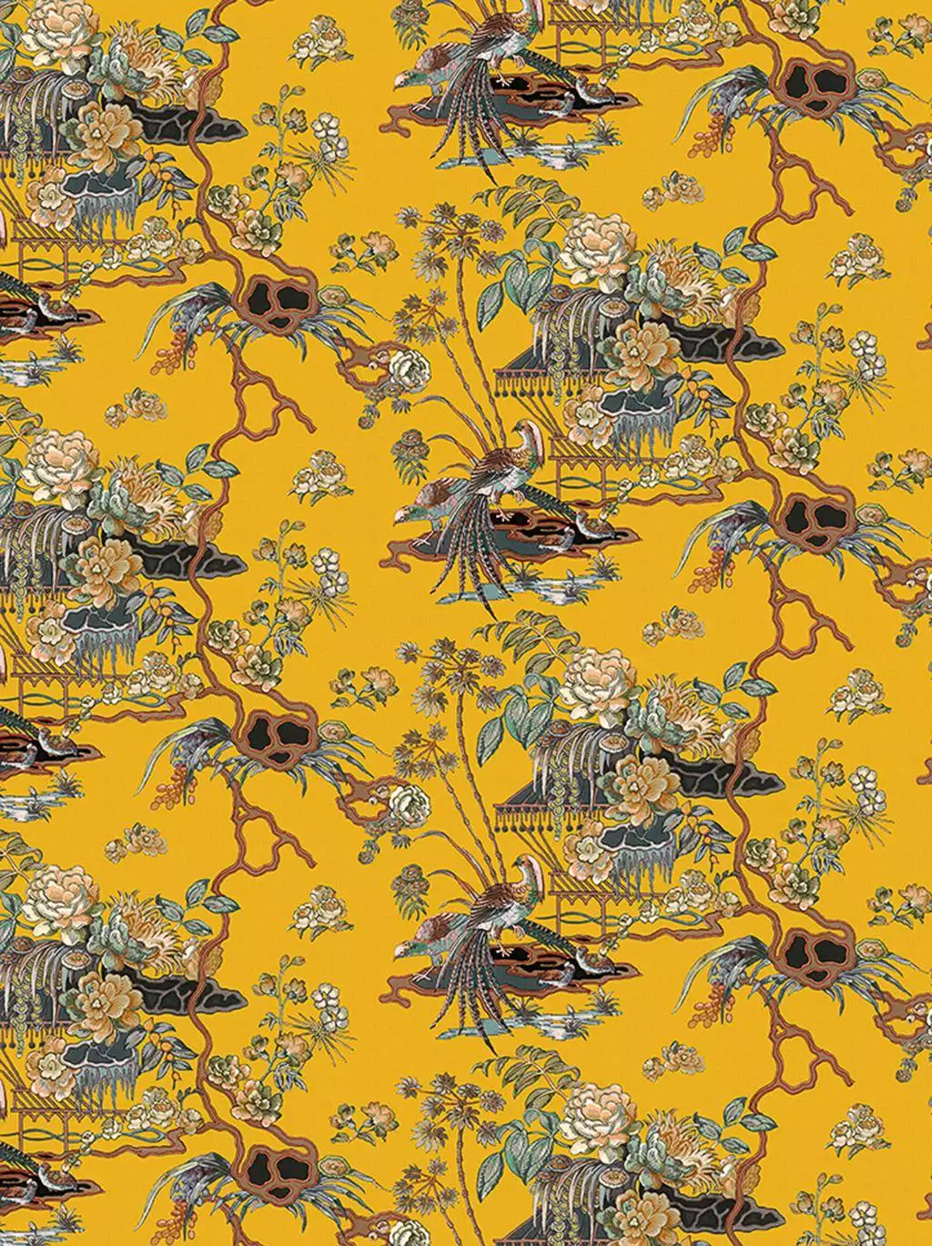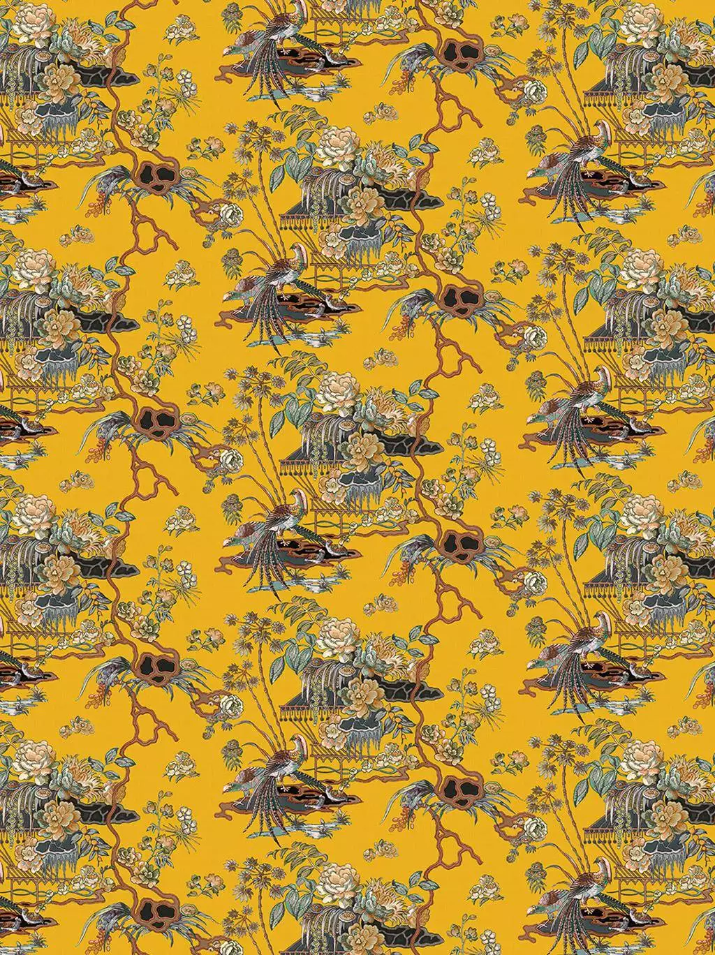 Die Tapete Sacred Pheasants Amber erstrahlt in einem prächtigen Gelbton, der mit exotischen Motiven verziert ist. Majestätische Fasane, eingebettet in detailreich gestaltete Blumenarrangements und kunstvolle Pagoden, laden zu einer Reise in die fernöstliche Welt ein. Die opulente Darstellung erinnert an traditionelle Chinoiserie und verleiht jedem Raum eine zeitlose Eleganz. Perfekt für Wohnbereiche, in denen ein Hauch von Extravaganz und Wärme erwünscht ist. Kombiniert mit dunklen Holzmöbeln oder dekorativen Elementen wird diese Tapete zum Highlight jeder Einrichtung.