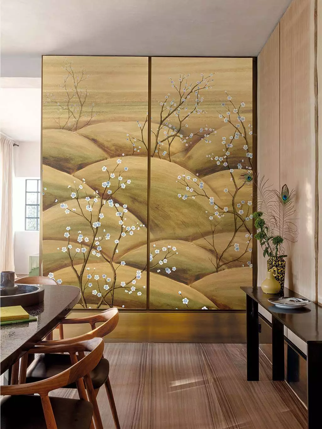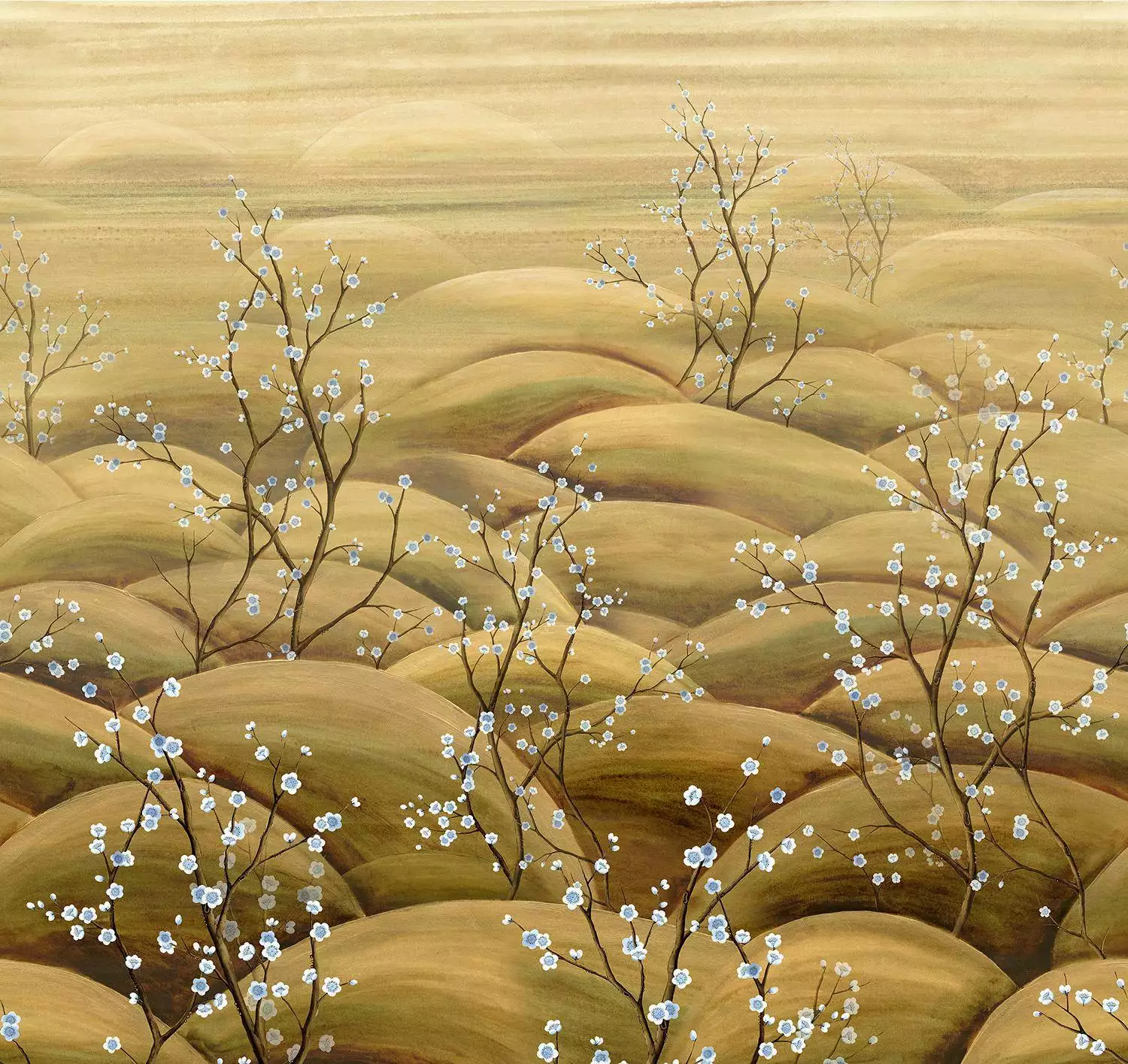 Die Tapete Sakura Midori setzt mit ihrer Ruhe, Klarheit und Wertigkeit einen warmen, gestalterischen Akzent. Das poetische Panorama nimmt die Symbolik der japanischen Kirschblüte auf und kleidet die stille Schönheit der Sakura mit der ruhigen Ästhetik japanischer Landschaftsmalerei in warme, goldgrüne Töne. Sanft modellierte Hügel wirken wie weiche Wellen im Raum, durchzogen von feinen Kirschzweigen mit hellen Blüten. Die feine Leinenstruktur verleiht dem Wandbild ausdrucksvolle Tiefe. Feiner Micaglanz taucht die Oberfläche in sanftes Abendlicht.