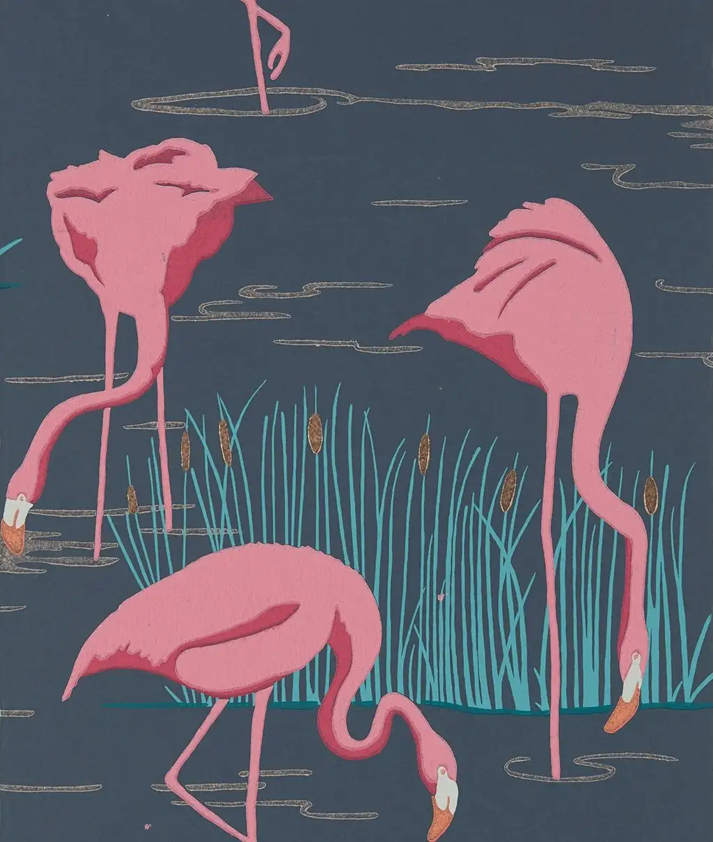 Sie lieben moderne Formen und Farben, wollen aber trotzdem einen Hauch Luxus und Eleganz in Ihre vier Wände bringen? Dann ist die Tapete Salinas von Harlequin eine wunderbare Möglichkeit, Moderne mit Luxus und Individualität zu verbinden. Auf ihr tummeln sich handgedruckte Flamingos, die zwischen locker arrangierten Bambuspflanzen im seichten Wasser nach Nahrung suchen. Die Kolben der Bambusrohre setzen schimmernde Akzente, was die Tapete an der Wand wunderschön im Licht changieren lässt.