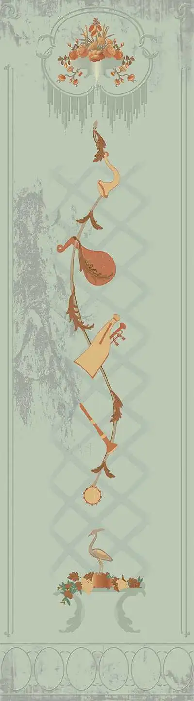 Inspiriert von den bunten und reich verzierten Zimmern und Gärten des "Sanssouci Palast" in Potsdam.Die Motive der Tapete geben ihr einen einzigartigen, fröhlichen Charakter."Sanssouci" bedeutet unbeschwert und ohne Sorgen in französicher Sprache und dies ist meine Interpretation des Palastes.