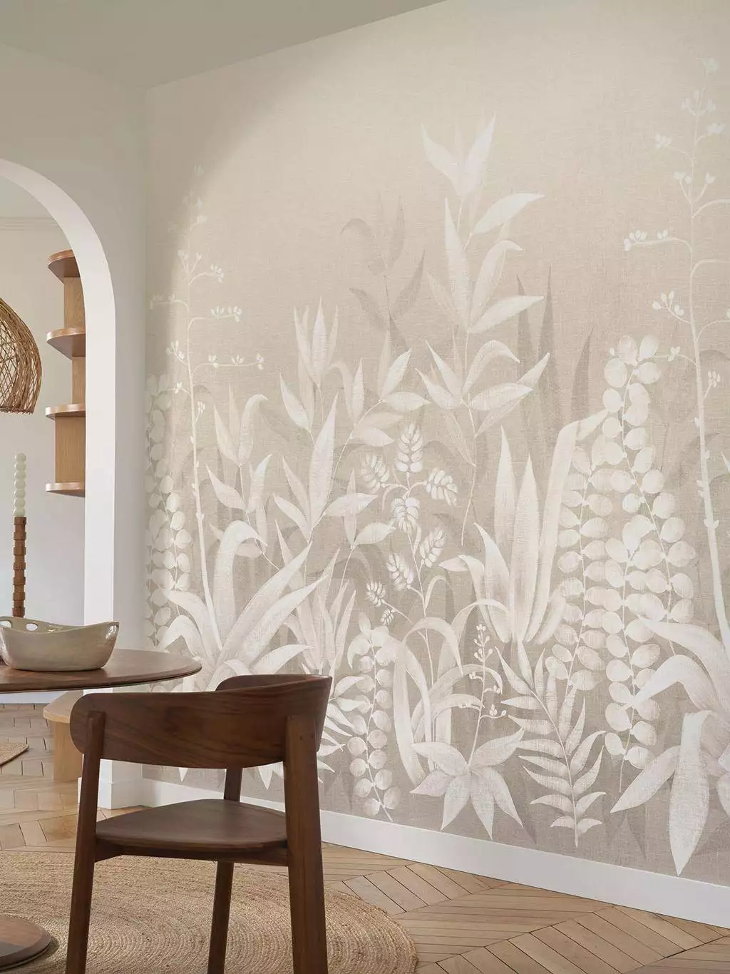 Die Tapete Saona Col. 04 entfaltet die Schönheit mediterraner Vegetation und zeigt den Zauber von Cala Saona, einem der schönsten Orte auf Formentera. Silhouetten von Agaven und Aloen zeichnen sich in großen, sanften Schwüngen auf einem leinenartigen Fond ab, sanft getönt in Creme und Hellbraun. Das Design erinnert an frühlingshaft lichtdurchflutete Gärten Saonas und bringt natürliche Ruhe an die Wand – ruhig, warm und elegant. Die Motivtapete wird für ein einfaches Anbringen als Set in vier 68 cm breiten Bahnen geliefert.