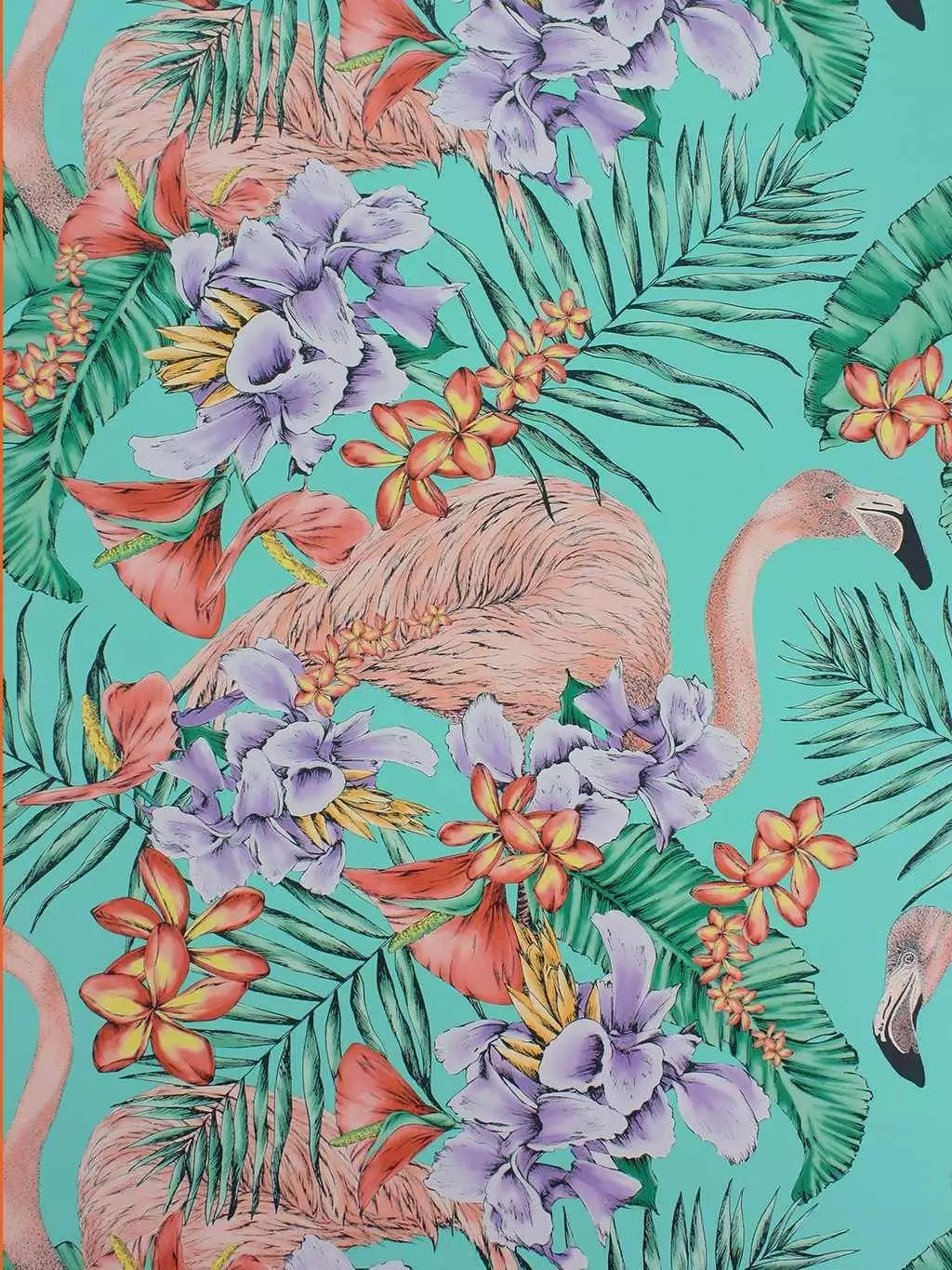 Tapete Sargon – Exotische Lebendigkeit trifft auf künstlerischen Charme. Dieses farbenfrohe Design präsentiert üppige tropische Blüten, majestätische Flamingos und leuchtend grüne Palmenblätter auf einem strahlenden Türkishintergrund. Die Kombination aus satten Farben und handgezeichneten Details bringt Urlaubsstimmung in Ihre Räume. Eine lebhafte, tropische Kulisse für moderne Interieurs!