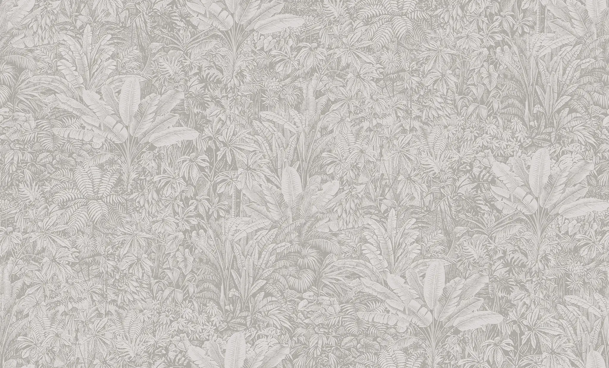 Verschiedenste, wie zufällig angeordnete tropische Blätter und Pflanzen in einem kühlen Silberton geben dieser wunderschönen Vliestapete einen einzigartig exotischen Glamour.