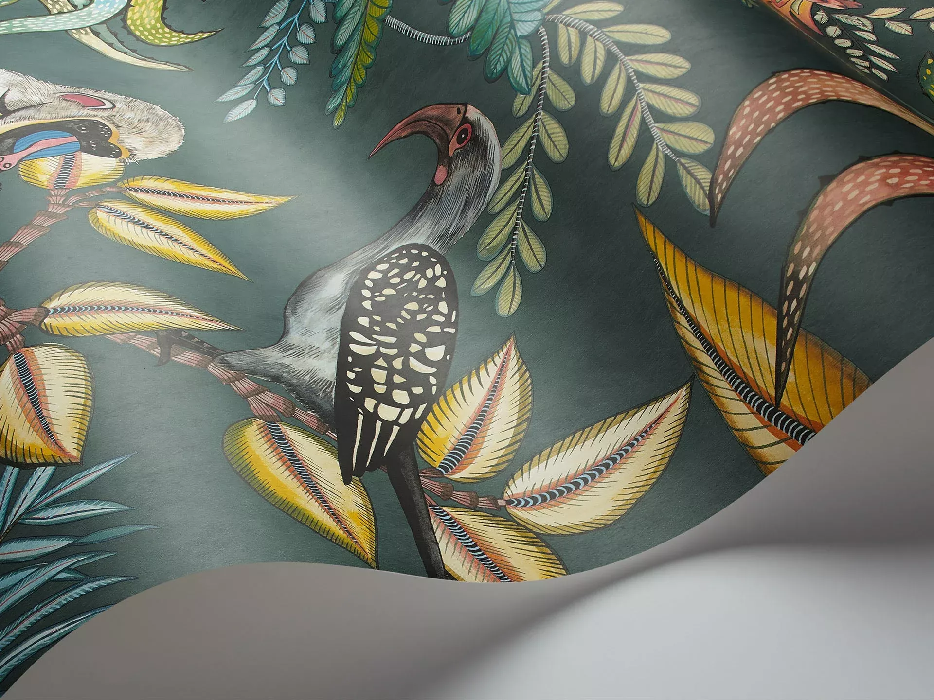 Bright Multi on Dark Viridian. Auffallend bunt und erfrischend anders! Liebevoll gestaltet und verarbeitet verleiht die Tapete "Savuti" der Marke Cole & Son dem Raum eine ganz individuelle Note.