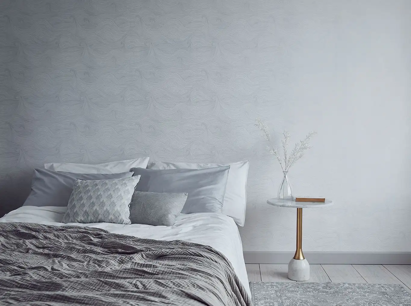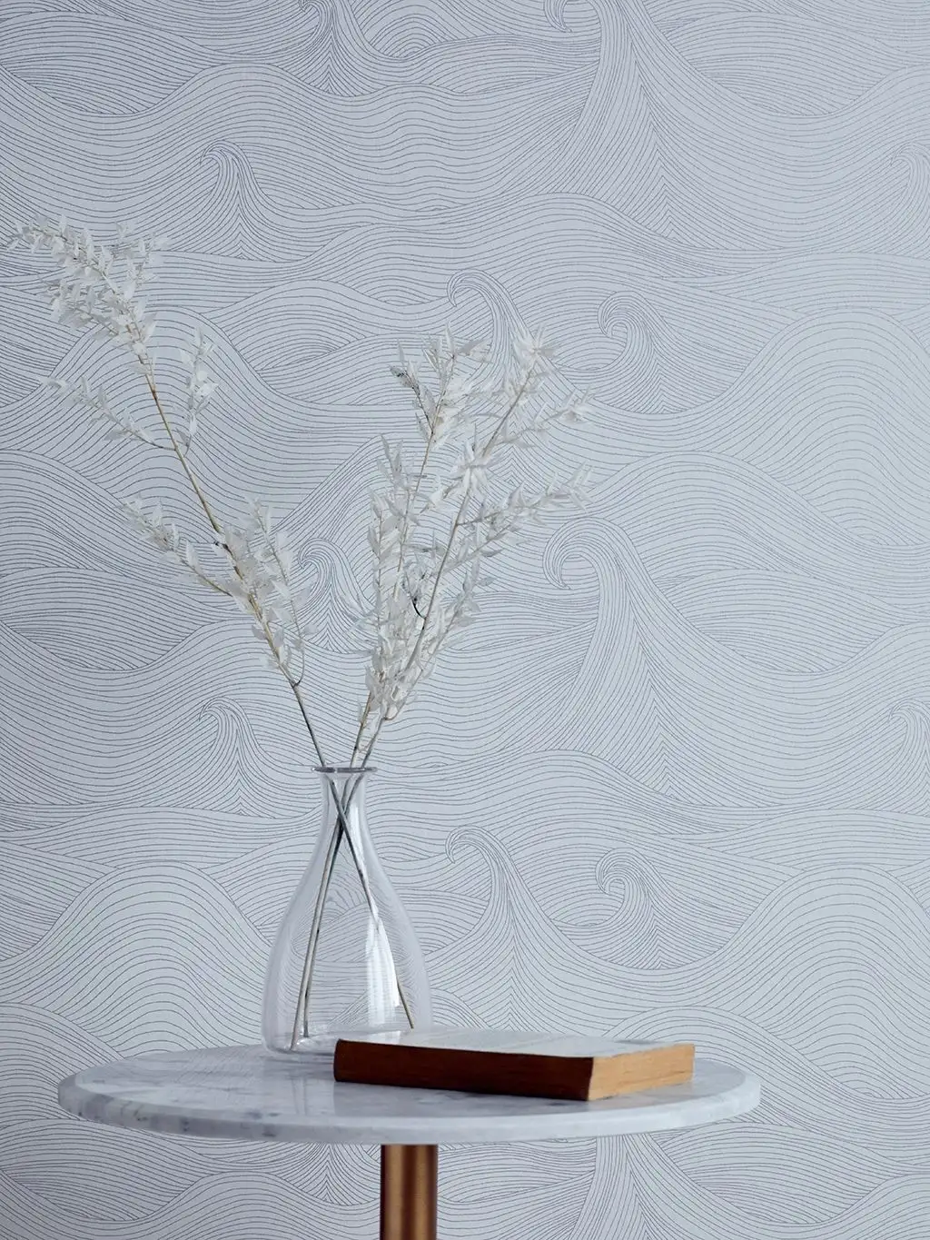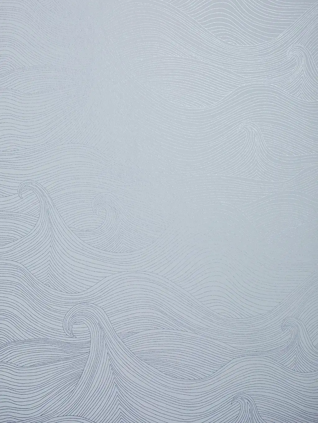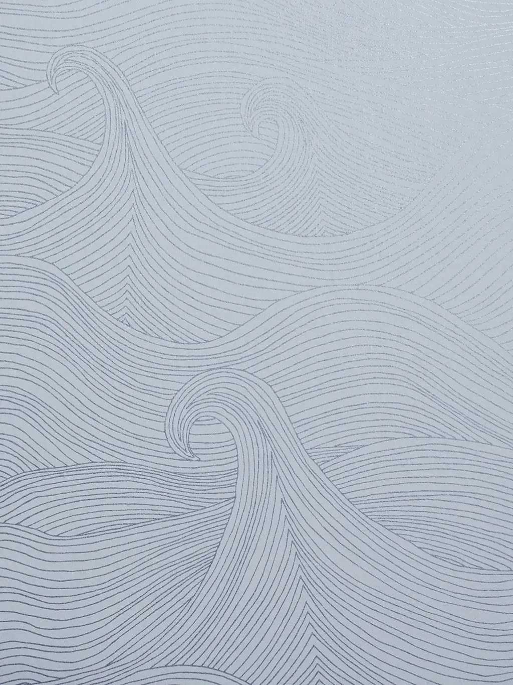 Seascape Moonlight, eco-non woven ist eine Strichzeichnung aus blassmetallisch silbernen Wellen, die im Licht auf weißem Grund schimmern. Das Muster ist von den rollenden Wellen eines stürmischen Meeres inspiriert, das über Ihre Wände fließen soll.