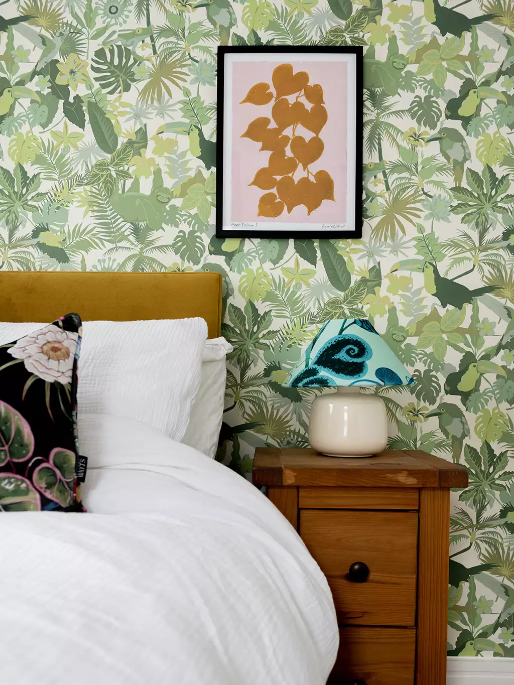 "Selva Tapete" in der Farbvariante "Foliage-Green" ist eine Hommage an die Dschungellandschaften Costa Ricas. Sie zeigt einheimische Tierarten wie Faultiere, Tukane und Laubfrösche, die sich im üppigen Laub verstecken. Die Farbgebung Foliage green spielt mit subtilen Nuancen verführerischer Grüntöne, die auf einem cremefarbenen Hintergrund in Szene gesetzt sind.
