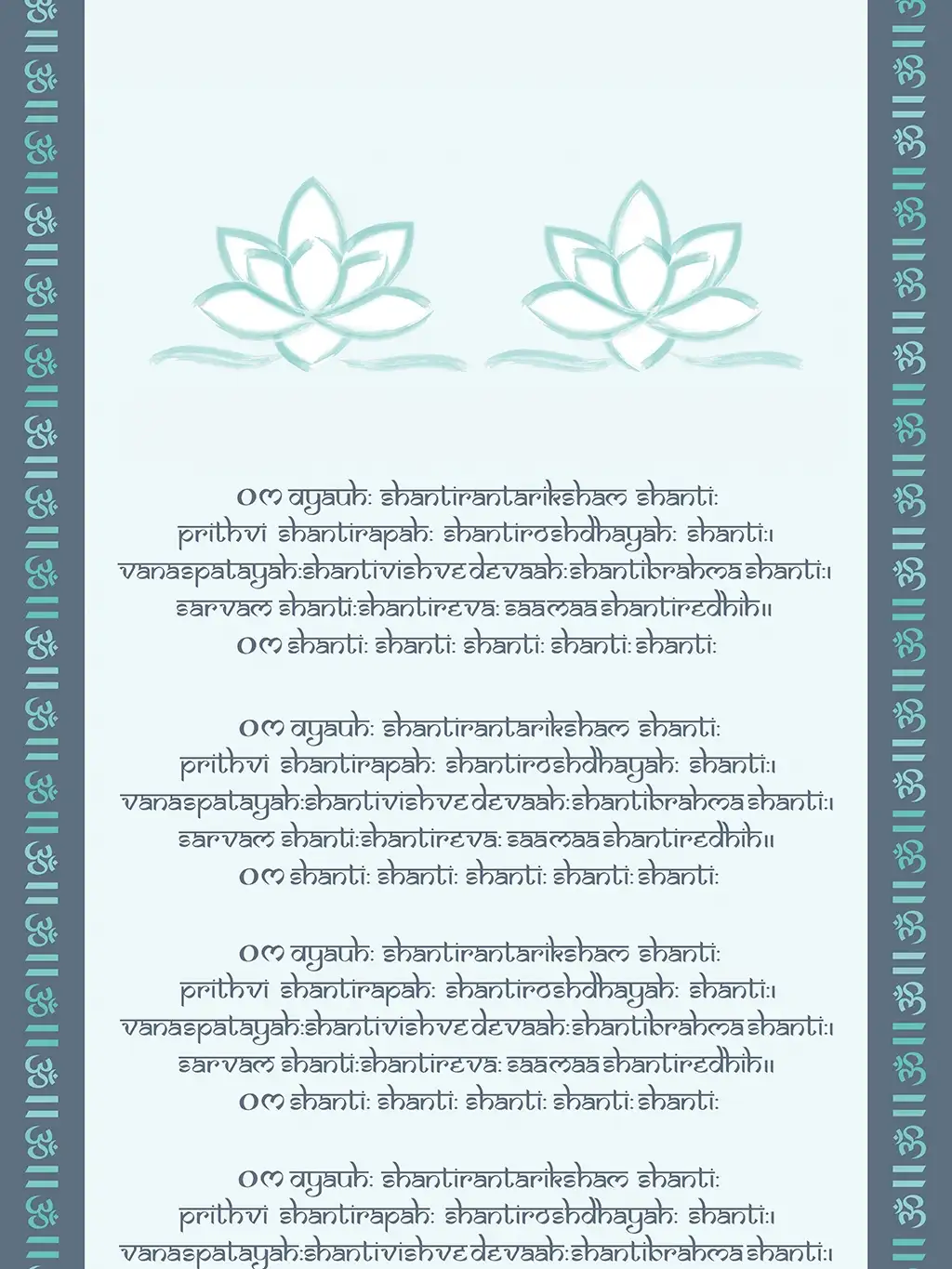 Das Om Shanti Mantra ist das Mantra des inneren Friedens und strahlt direkt und indirekt auf deine Umgebung und deine Beziehungen aus. Ein meditativer Weg , Ruhe und Gelassenheit in das Leben einzuladen und zu integrieren. Die Shanti Mantra VliesTapete ist perfekt fütr Yoga-Studios , aber natürlich auch für jeden anderen Raum.