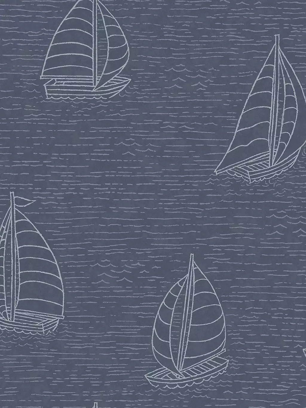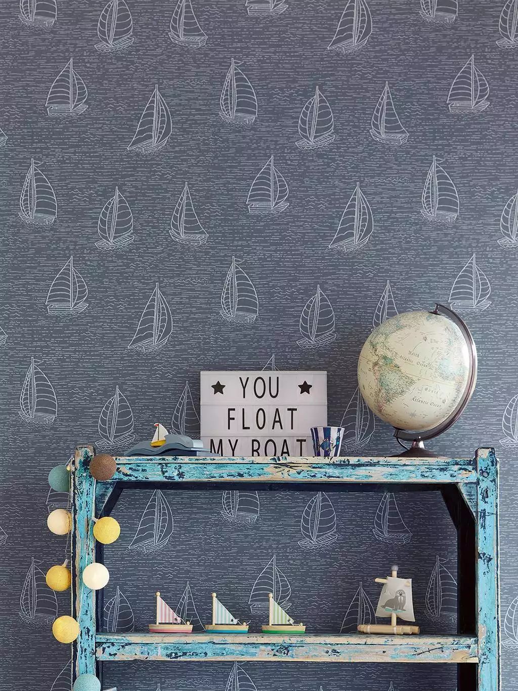 Bereiten Sie sich auf eine Seefahrt vor, mit Segelschiffen, die über das Meer segeln. Diese Kinderzimmer Tapete ist in dunkelblau und weiß gehalten und verleiht Ihrem Raum ein maritimes Flair.