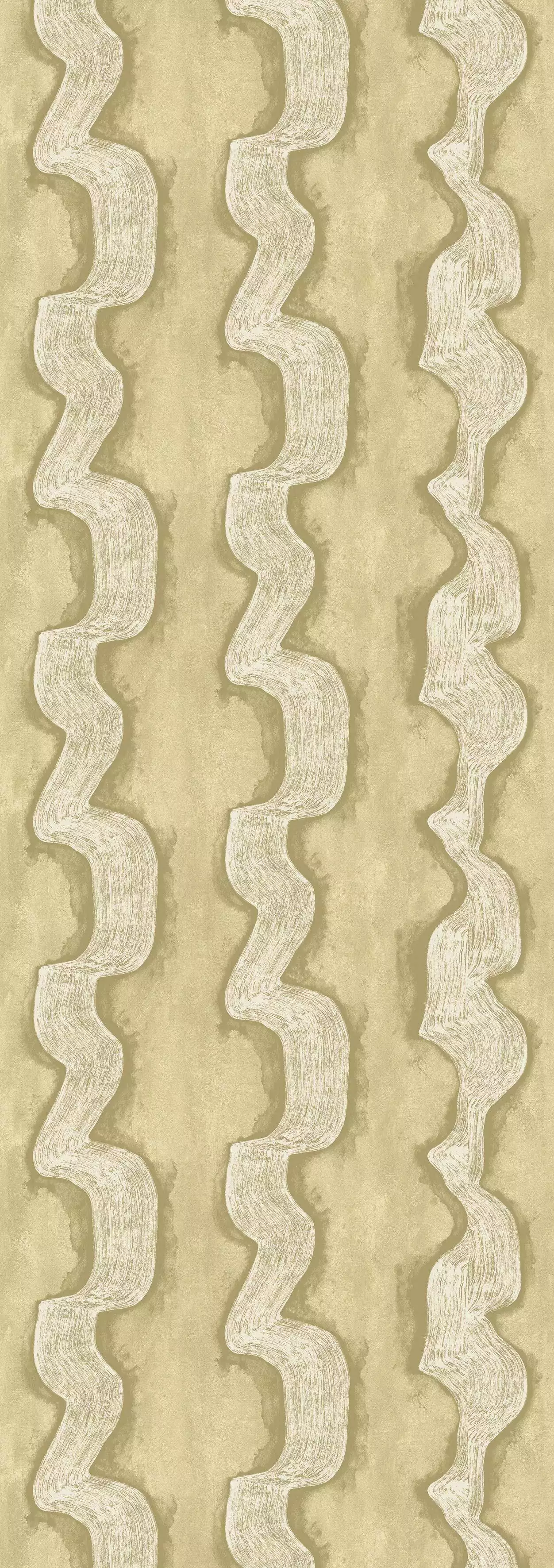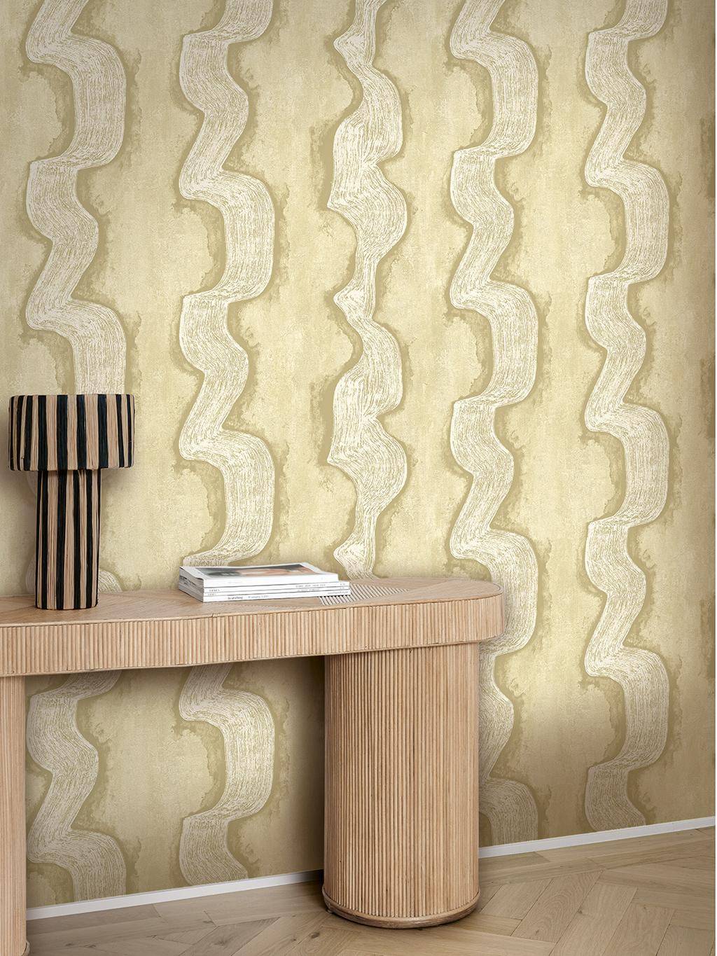 Die Tapete Shodo Gold aus der Kollektion Traces bringt die ruhige Geste eines Pinselstrichs auf die Wand. Breite, organische Linien ziehen sich in weichen Bewegungen nach unten, als hätte jemand mit sicherer Hand Farbe über eine Leinwand geführt. Der Fond zeigt eine subtile Textur, die an gewaschenes Leinen erinnert; feiner Perlglanz lässt das Motiv je nach Licht lebendig schimmern. Hier wirken Gelassenheit und handwerkliche Präsenz in Räumen, die Wärme, Bewegung und ein Hauch Kunsthandwerk verkörpern möchten.