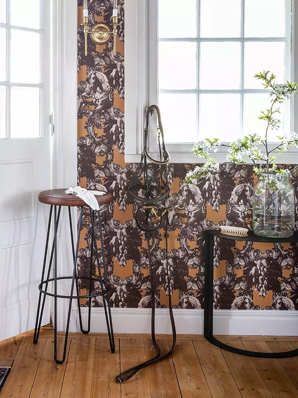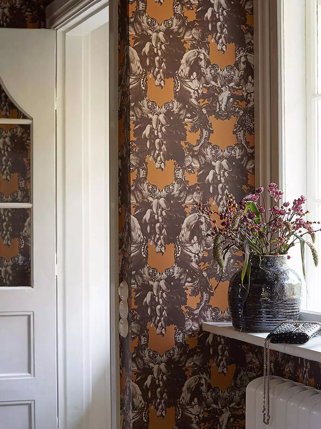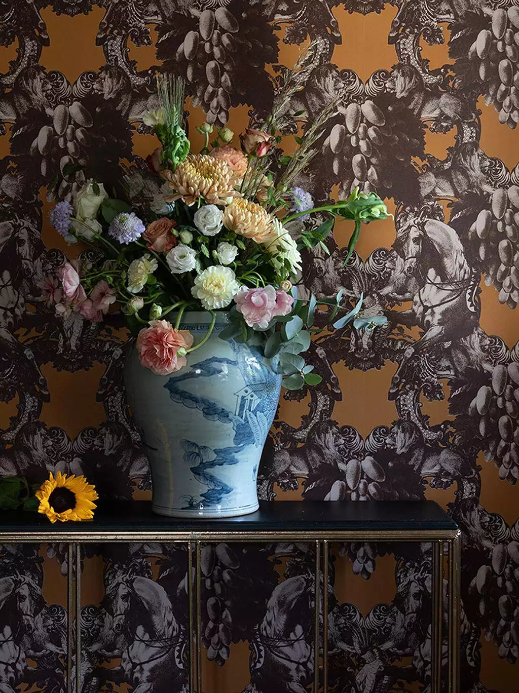 Sir Grace, Yellow kombiniert barocke Ornamentik mit grafischer Strenge. Dunkle, detailreiche Zeichnungen von Pferden, Trauben und floralen Motiven entfalten sich vor einem kraftvollen Gelbton, der die Tiefe der Schwarznuancen noch verstärkt. Das Spiel aus opulenter Fülle und klarer Fläche schafft Spannung und verleiht dem Raum dramatische Präsenz. Die Komposition wirkt wie ein modernes Stillleben – zugleich historisch inspiriert und zeitgenössisch interpretiert. Eine Tapete, die Geschichten erzählt und luxuriöse Intensität mit künstlerischem Ausdruck verbindet.