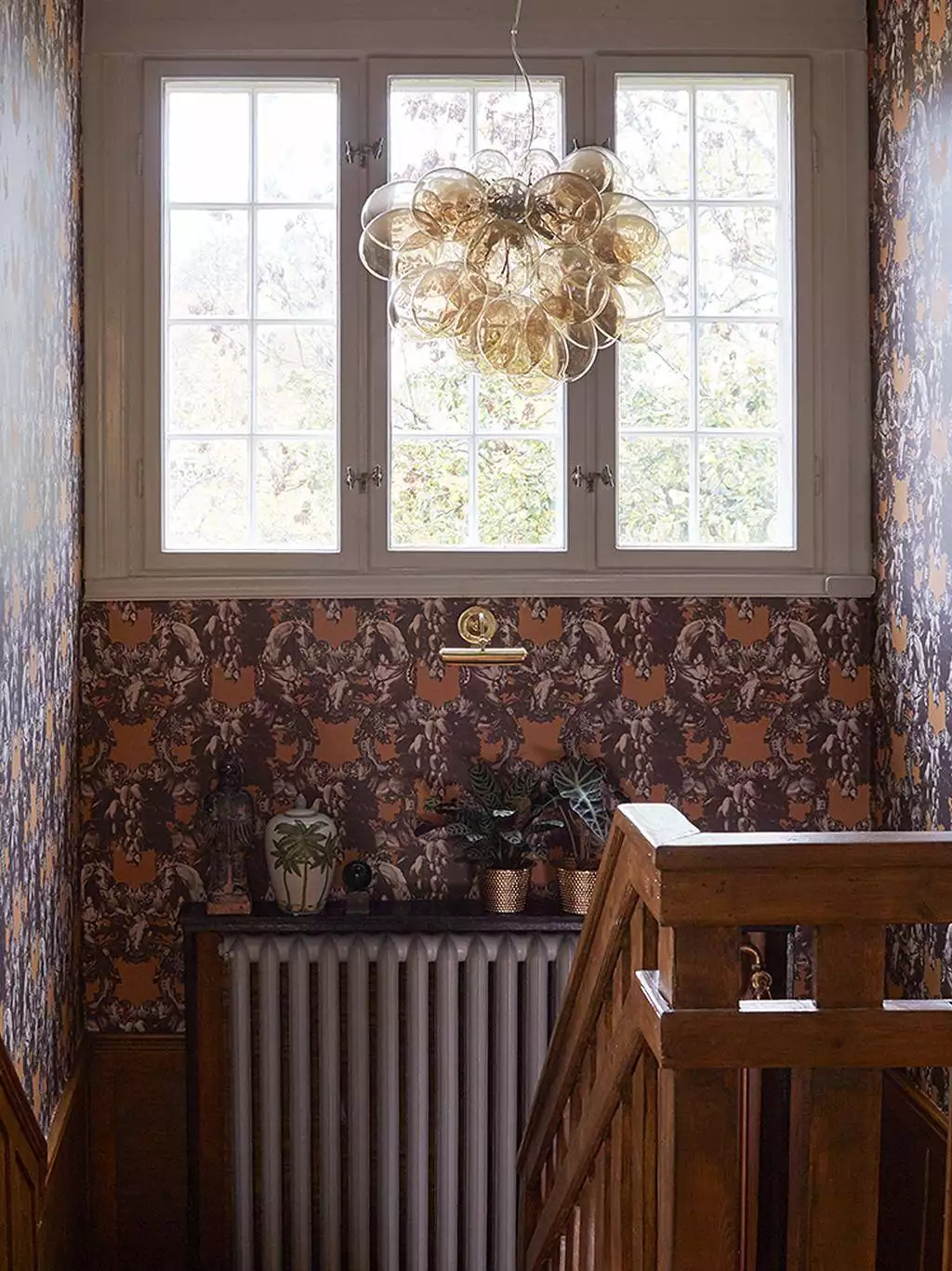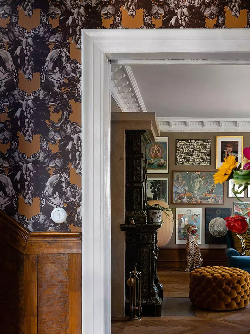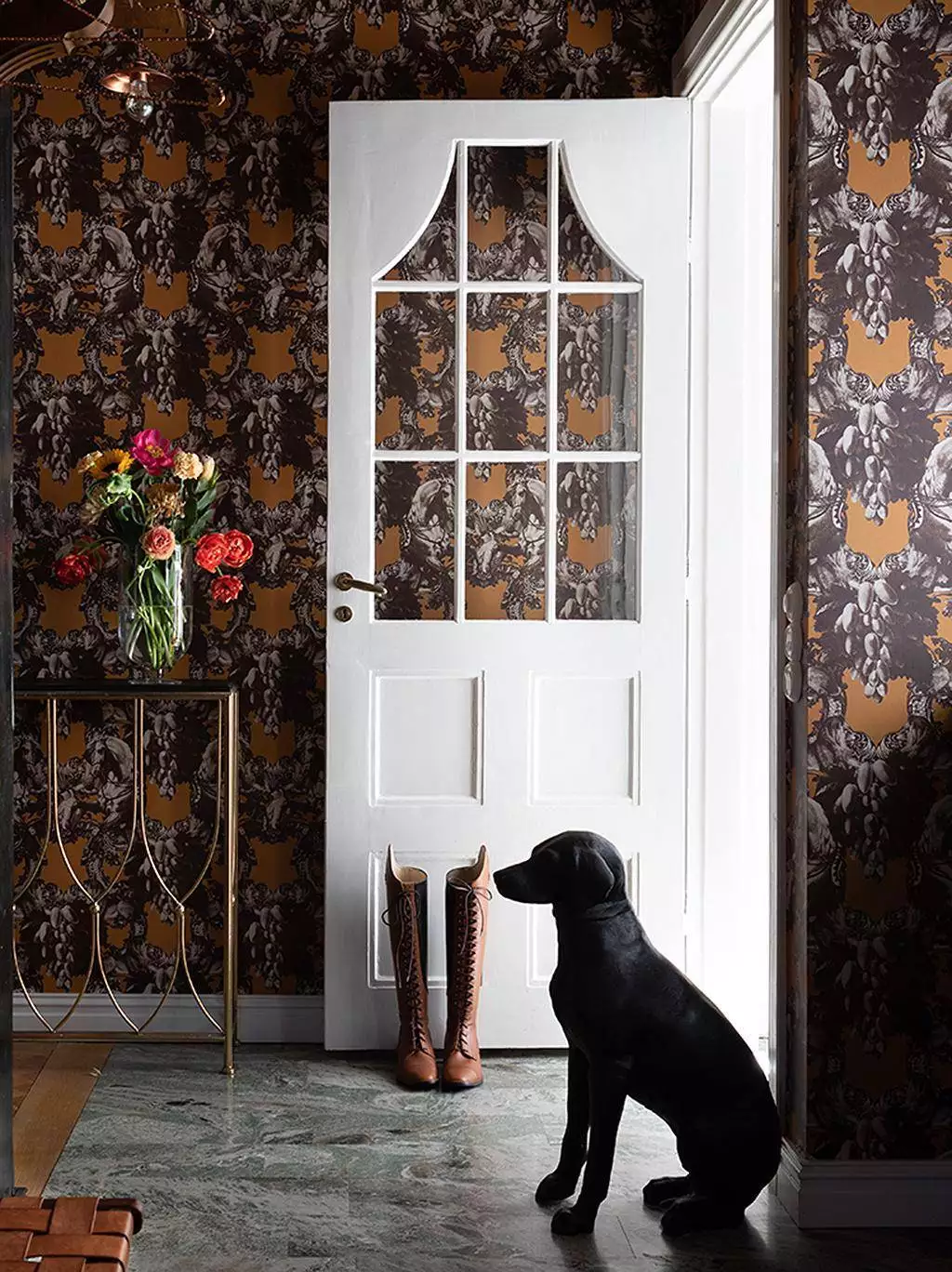 Sir Grace, Yellow kombiniert barocke Ornamentik mit grafischer Strenge. Dunkle, detailreiche Zeichnungen von Pferden, Trauben und floralen Motiven entfalten sich vor einem kraftvollen Gelbton, der die Tiefe der Schwarznuancen noch verstärkt. Das Spiel aus opulenter Fülle und klarer Fläche schafft Spannung und verleiht dem Raum dramatische Präsenz. Die Komposition wirkt wie ein modernes Stillleben – zugleich historisch inspiriert und zeitgenössisch interpretiert. Eine Tapete, die Geschichten erzählt und luxuriöse Intensität mit künstlerischem Ausdruck verbindet.