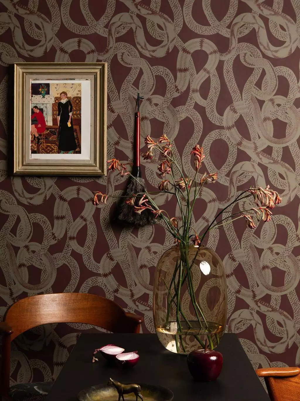Snake Peek, Red spielt mit der Symbolik der Schlange – geheimnisvoll, kraftvoll und ein wenig gefährlich. In geschwungenen Linien winden sich die Schlangen über den tiefroten Hintergrund und erzeugen ein ornamentales Geflecht voller Dynamik. Das Motiv wirkt exotisch, beinahe hypnotisch, und verleiht dem Raum eine markante Intensität. Die Kombination aus organischem Schwung und strenger Wiederholung macht das Design zugleich wild und geordnet – eine Tapete, die nicht nur den Blick fesselt, sondern auch Geschichten von Mythos und Verführung anklingen lässt.