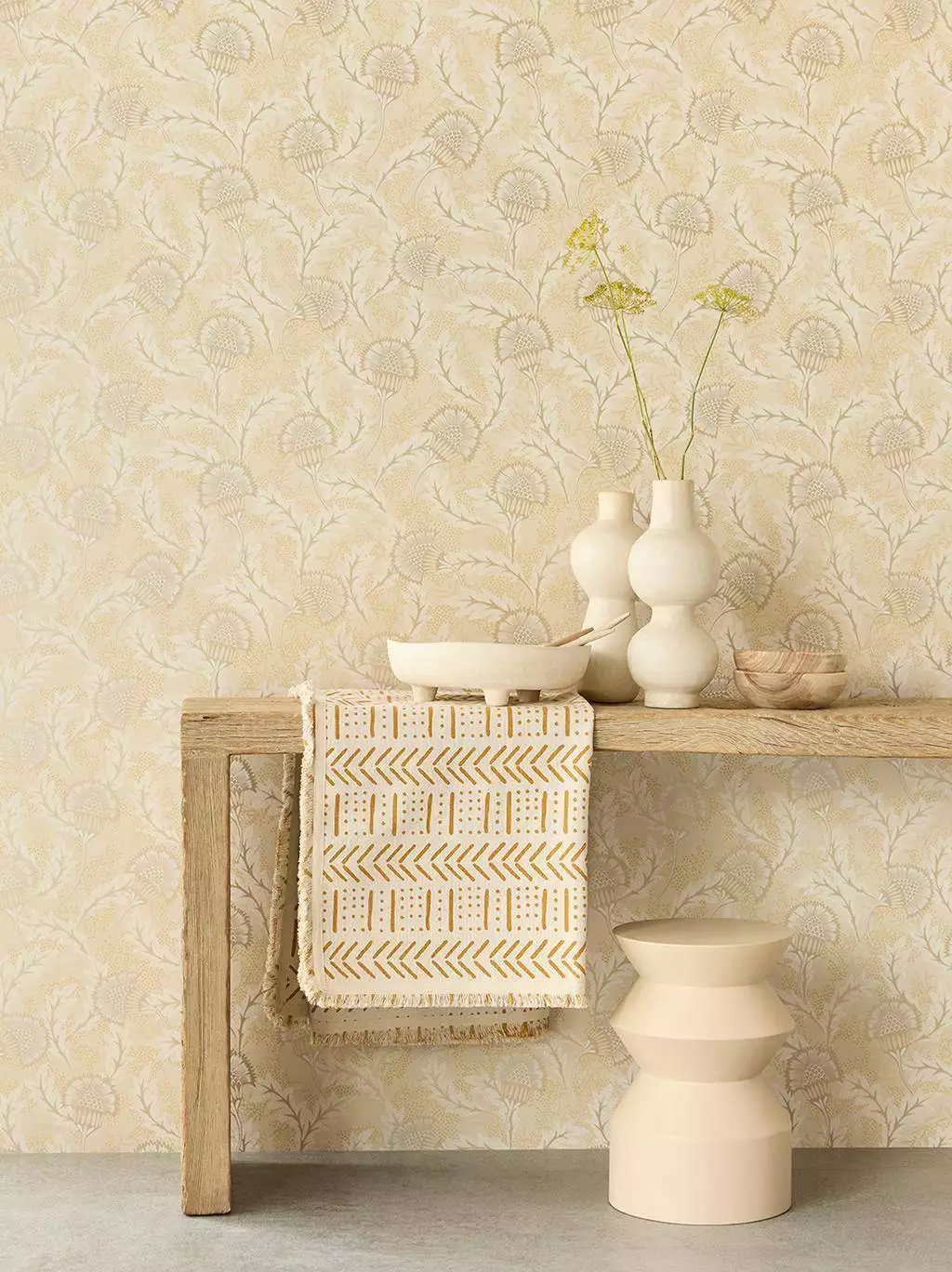 Solange Flower 340210 zeigt großformatige Blütenformen und angedeutete Blätter, die an Löwenzahn oder Disteln erinnern: feine Strukturen, strahlenförmig und leicht wild. In sanften Ecru-Nuancen mit matter Oberfläche entsteht ein ruhiges, charaktervolles Wandbild mit natürlicher Tiefe. Solange Flower wirkt stark als Akzentwand. Probieren Sie ruhig mal, das Motiv mit glatten, hellen Flächen und naturbelassenen Materialien wie Holz oder Stein zu kombinieren, so dass die strahlenförmigen Strukturen ihre Wirkung entfalten.