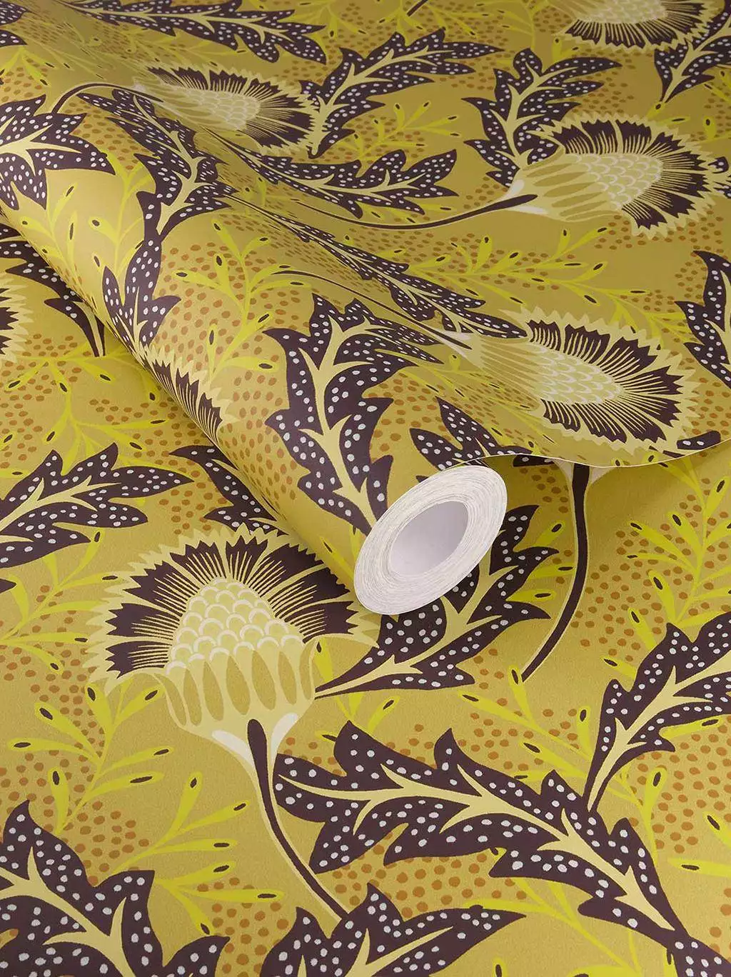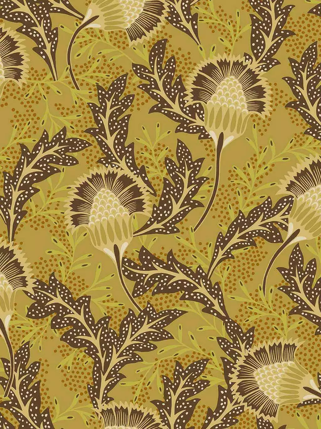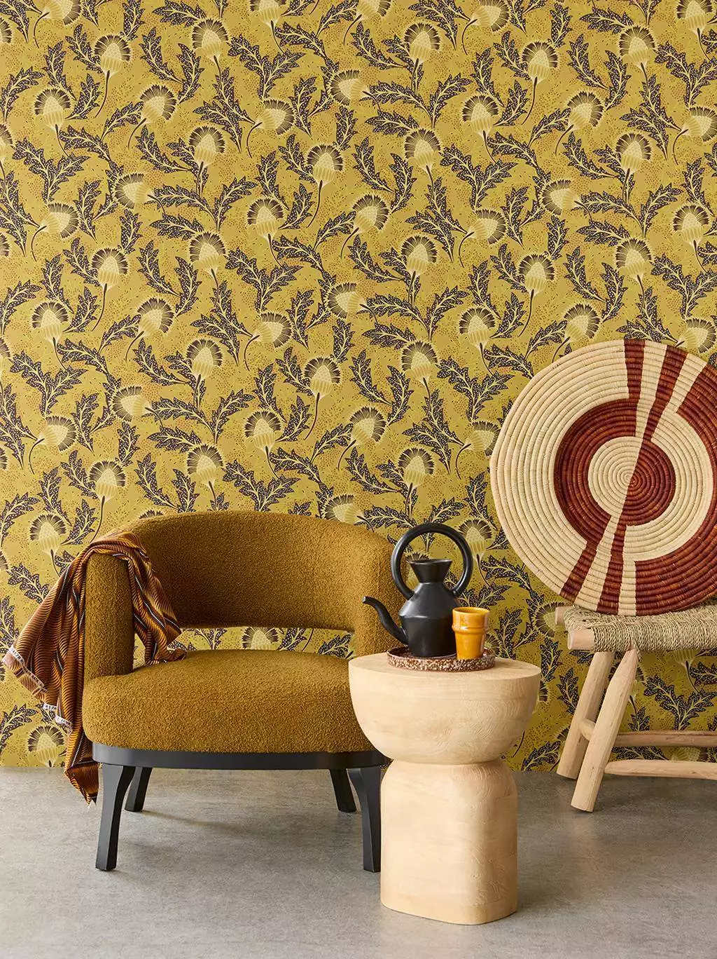 Solange Flower 340212 zeigt großformatigen Blütenstand und skizzierte Blätter, die an Löwenzahn oder Disteln erinnern: feine Strukturen, strahlenförmig und leicht wild. In warmem Senfgelb und Braun entsteht ein lebendiges Wandbild, das Energie und Wärme verströmt.