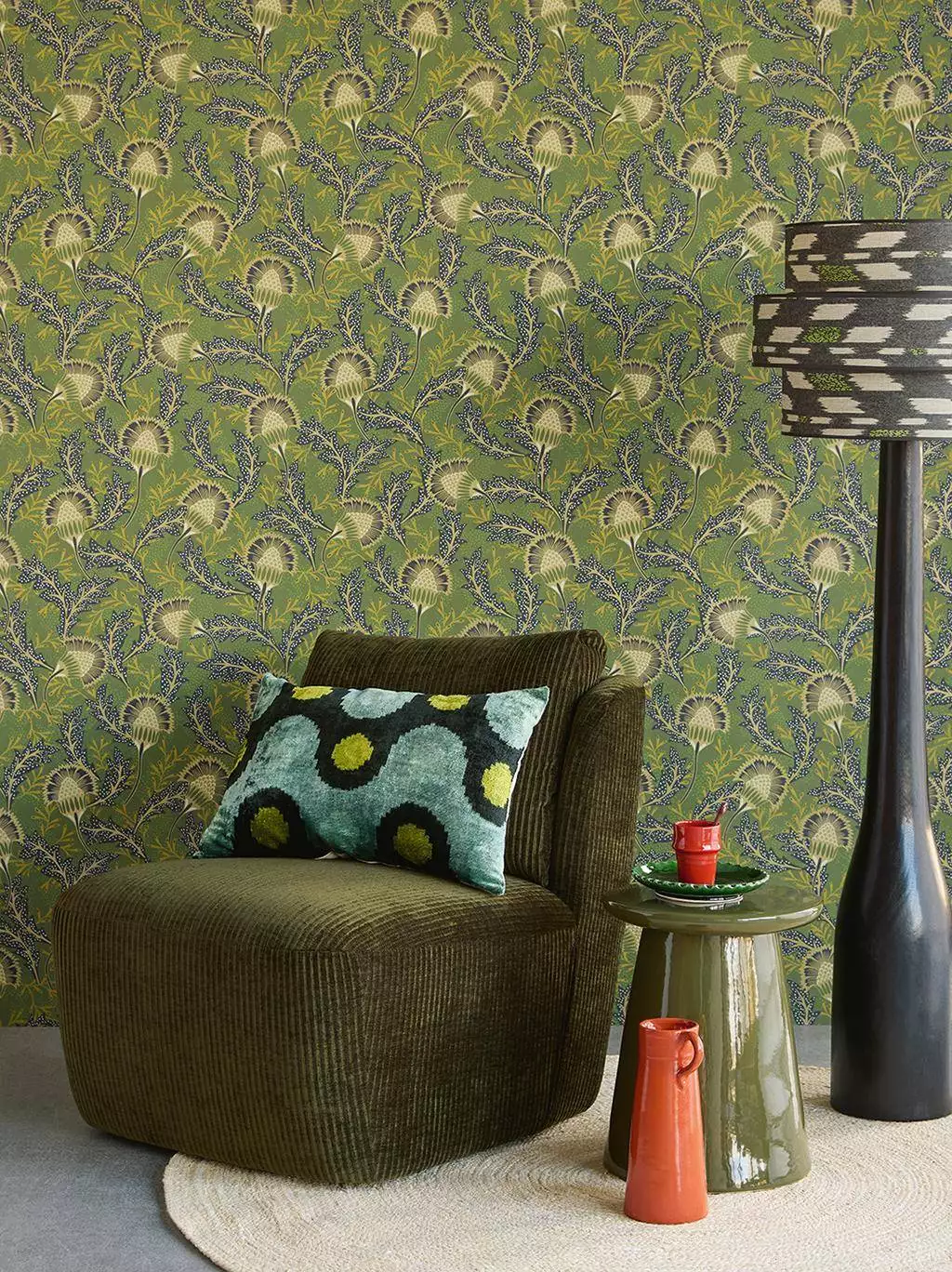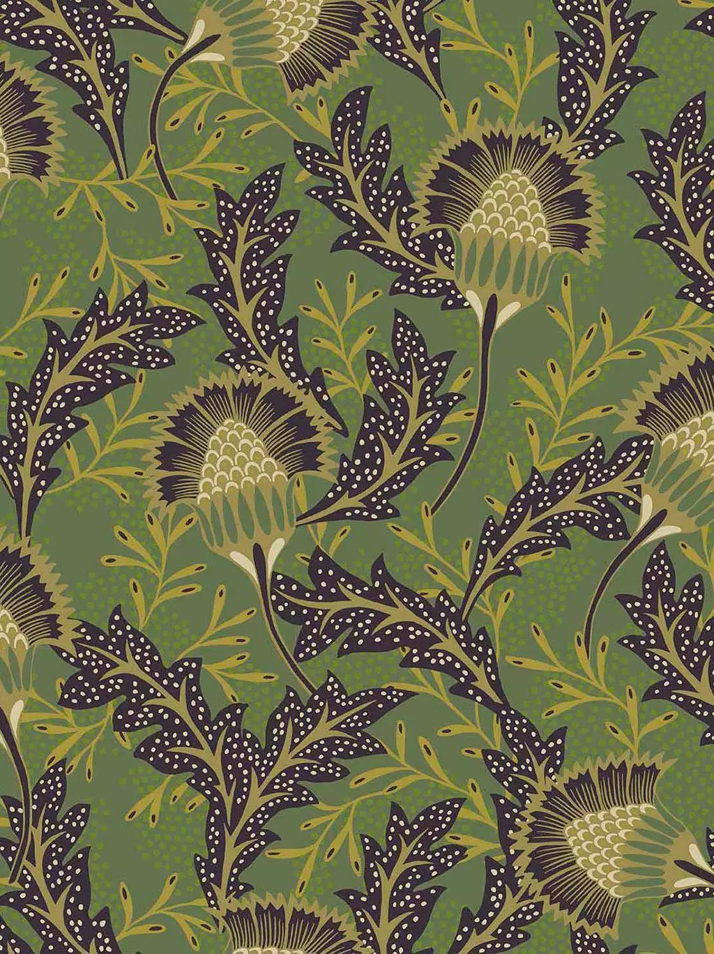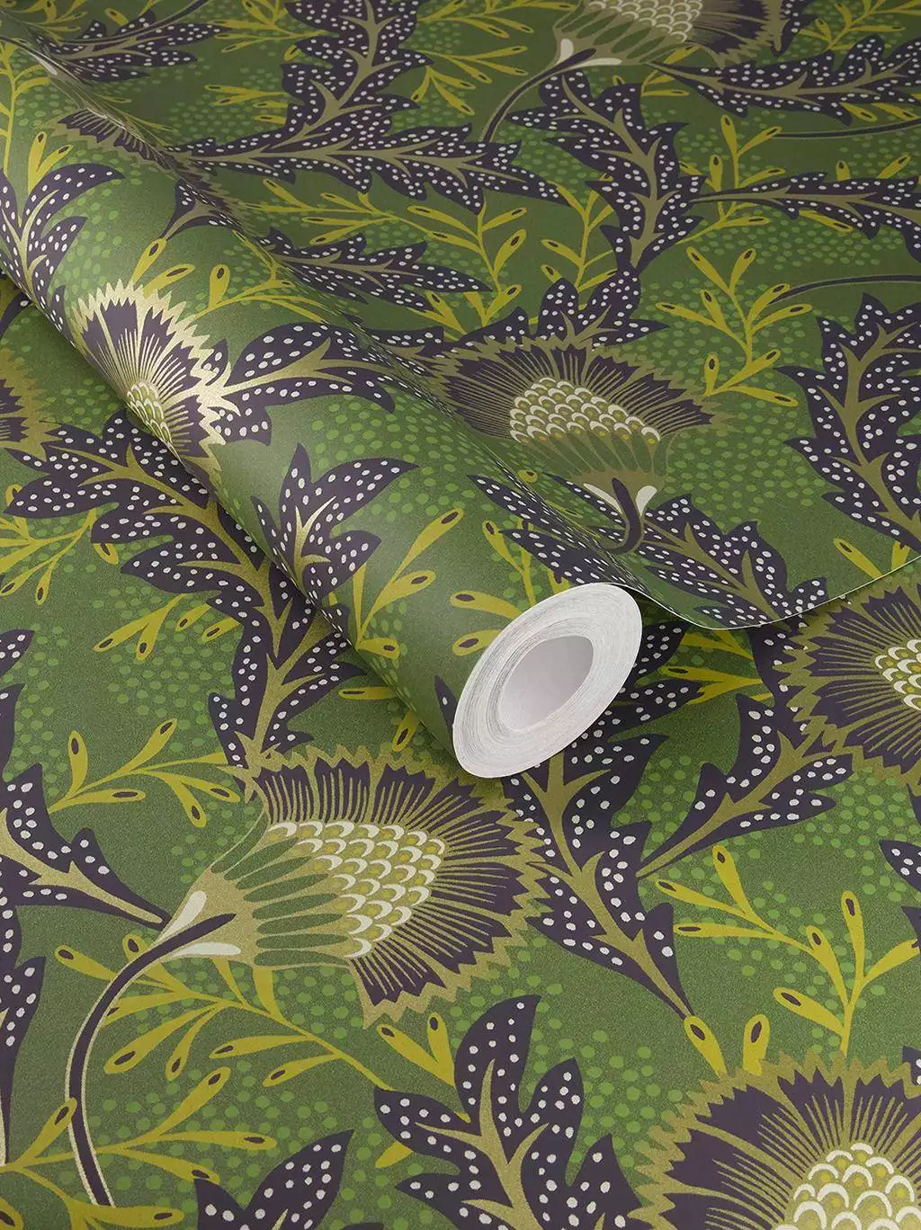 Solange Flower 340216 zeigt großformatige, strahlenförmige Blütenköpfe und spitze Blätter, die an Löwenzahn oder Disteln erinnern: feine Strukturen, leicht wild, wie eine Flora, die sich frei entfalten darf. Ein charaktervolles Wandbild mit natürlicher Tiefe. Kombinieren Sie das satte Grün mit hellen Hölzern und naturfarbenen Textilien. So wirkt das kräftige Muster ausbalanciert und bringt zugleich eine klare, erdige Ruhe in Ihren Raum.