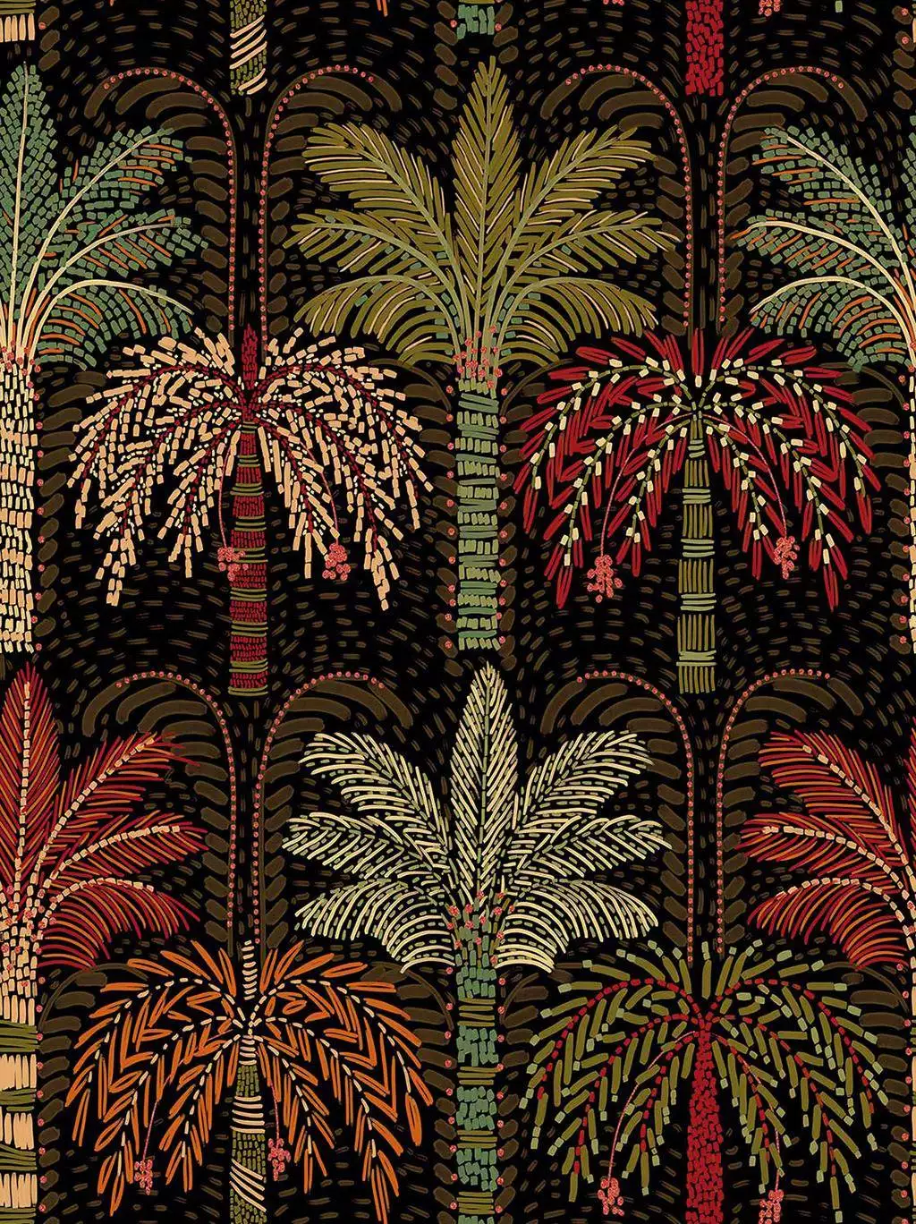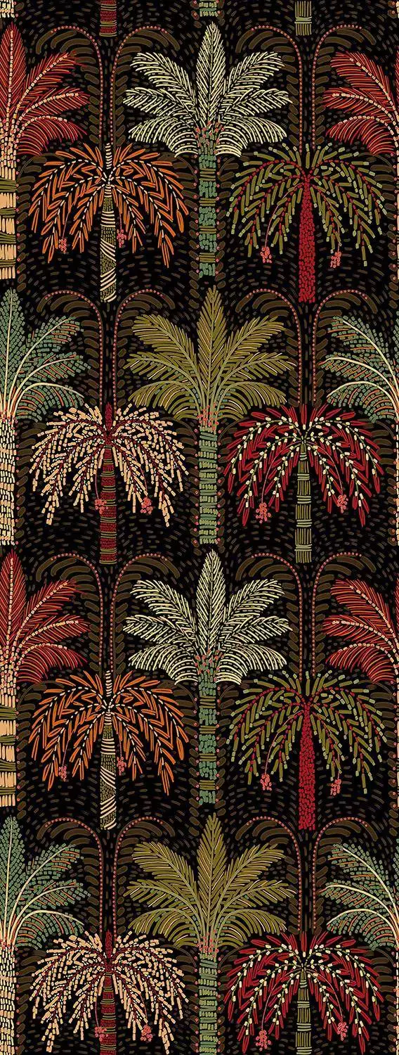 Die Tapete Solange Palmtrees zeigt ein dichtes Muster stilisierter Palmen in warmen Gelb-, Grün- und Rottönen auf dunkelbraunem bis schwarzem Hintergrund. Die feinen, punkt- und strichartigen Details verleihen den Blättern und Stämmen eine handgezeichnete, textilartige Anmutung, wodurch ein lebendiges, tropisches Gesamtbild entsteht.