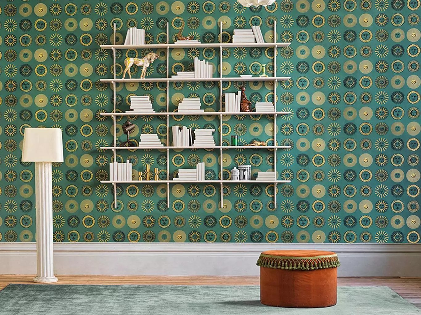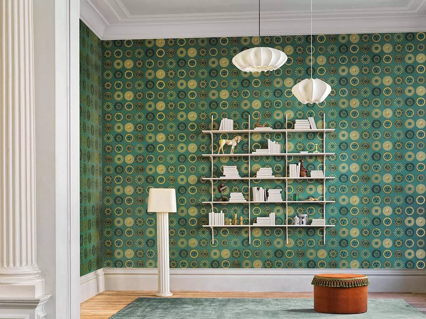 In dieser Variante trifft ein satter Smaragdton auf Gold und Tiefschwarz – eine Farbkomposition, die Tiefe schafft und dem Raum Charakter verleiht. Die Gestaltung wirkt rhythmisch und klar, zugleich verspielt und kontemplativ. Die klare Struktur schafft Ordnung, das wechselnde Mienenspiel der Sonnen belebt sie.