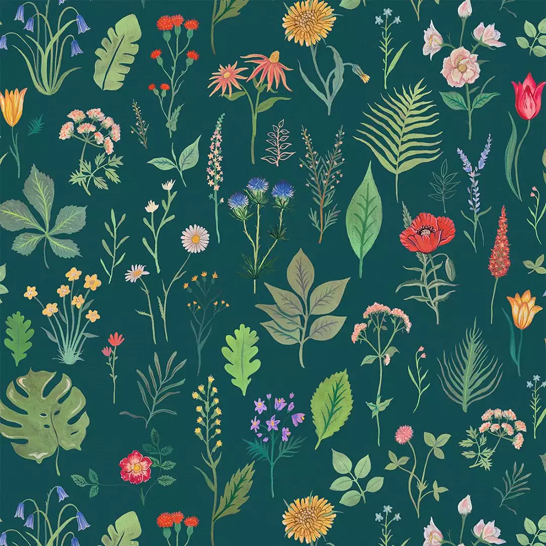 Sonder Tapete in Teal. Der Name "Sonder" steht für das tiefe Gefühl, dass jeder Fremde ein ebenso komplexes Leben hat wie das eigene. Wir glauben, dass dies auch für die natürliche Welt gilt! Unsere botanische Zweigstudie zeigt britische Wildblumen und Blätter wie Disteln, Hagebutten und Löwenzahn sowie viele weitere Heckenpflanzen und ist in einem von der Volkskunst inspirierten Stil gemalt. Sonder ist ein leuchtender Regenbogen von Frühlingsblumen, der durch die tiefe Grundfarbe Teal zum Leben erweckt wird. Eine subtile Leinenstruktur verleiht Ihren Wänden ein Gefühl von Wärme und Textur.