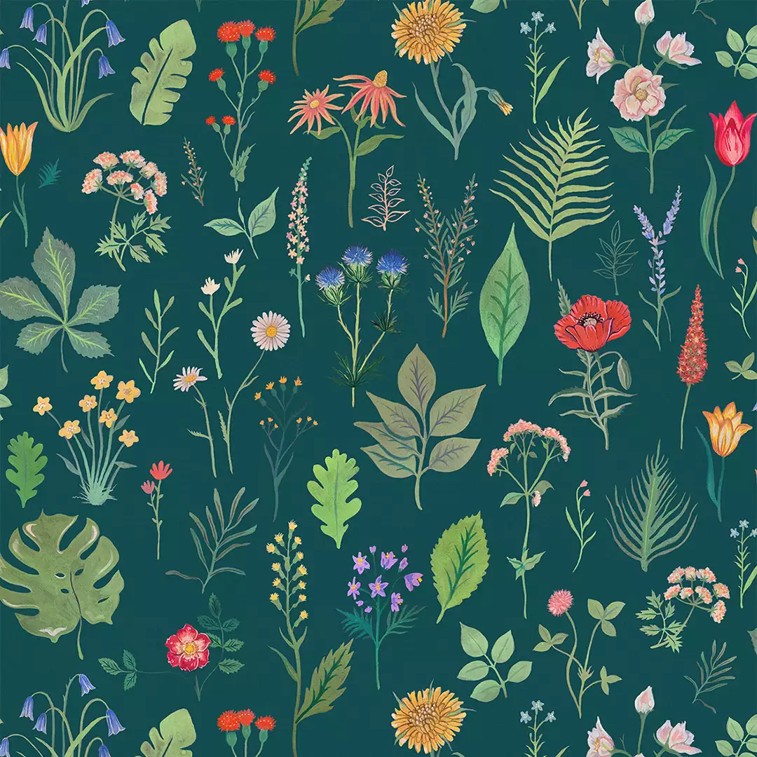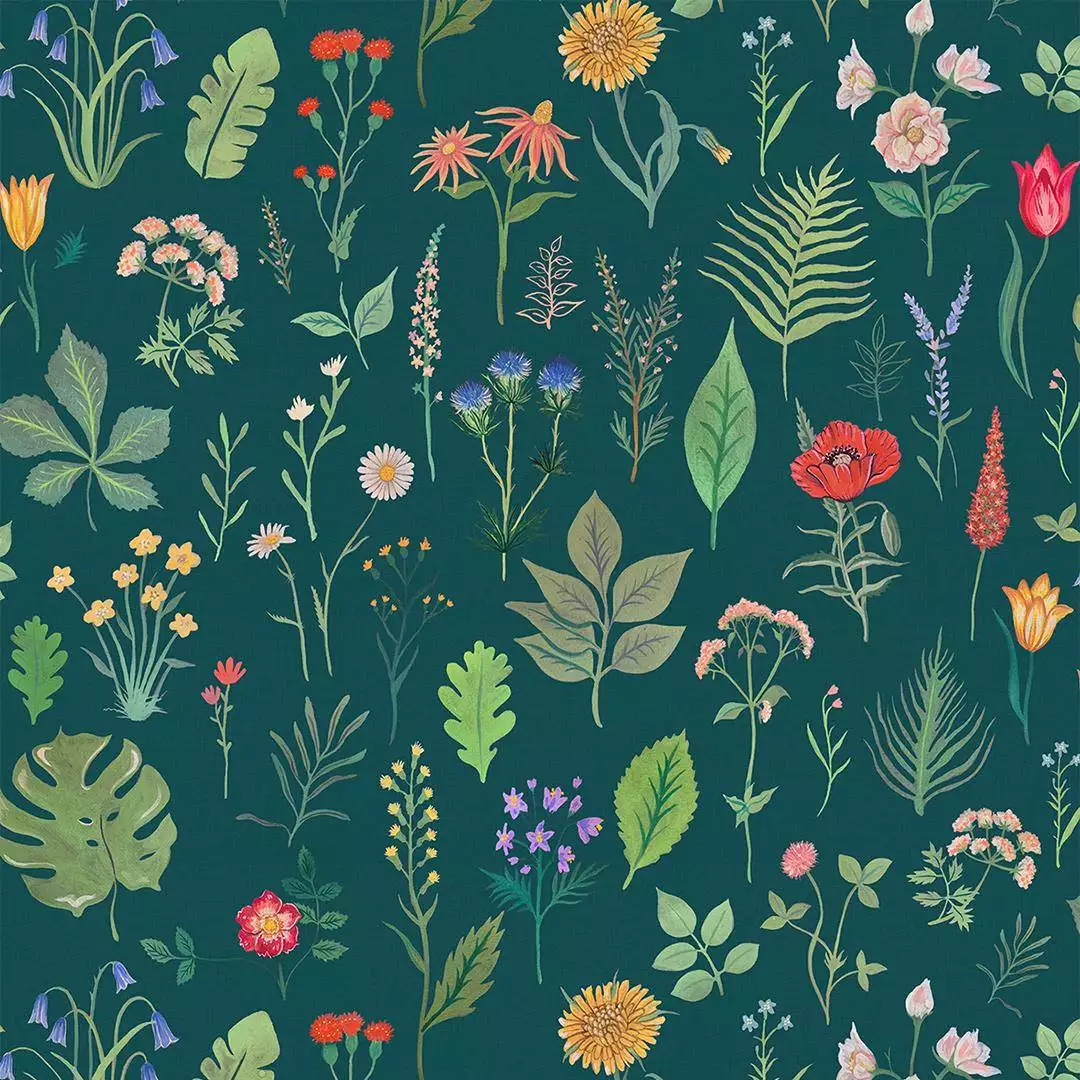 Sonder Tapete in Teal. Der Name "Sonder" steht für das tiefe Gefühl, dass jeder Fremde ein ebenso komplexes Leben hat wie das eigene. Wir glauben, dass dies auch für die natürliche Welt gilt! Unsere botanische Zweigstudie zeigt britische Wildblumen und Blätter wie Disteln, Hagebutten und Löwenzahn sowie viele weitere Heckenpflanzen und ist in einem von der Volkskunst inspirierten Stil gemalt. Sonder ist ein leuchtender Regenbogen von Frühlingsblumen, der durch die tiefe Grundfarbe Teal zum Leben erweckt wird. Eine subtile Leinenstruktur verleiht Ihren Wänden ein Gefühl von Wärme und Textur.