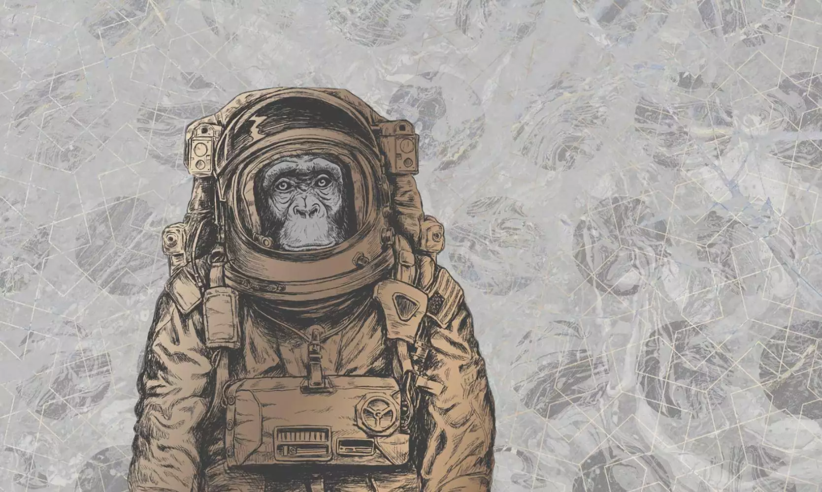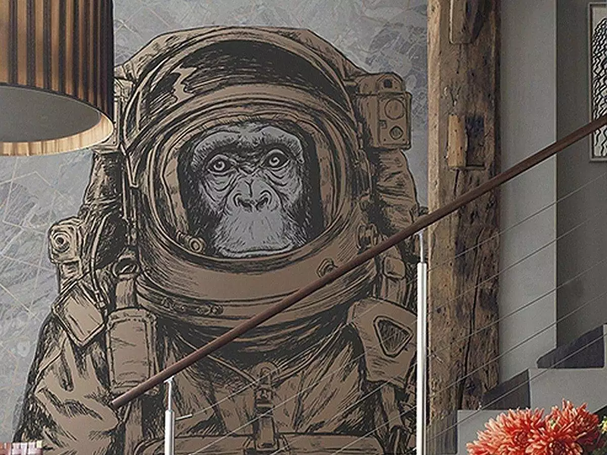 Die Bildtapete Space Monkey fällt sofort ins Auge: Ein detailreich gezeichneter Affe im Raumanzug blickt konzentriert aus dem Helm – irgendwo zwischen Neugier, Nachdenklichkeit und Absurdität. Vor einem grau strukturierten Hintergrund entfaltet sich ein Motiv, das zugleich humorvoll und fast philosophisch wirkt.