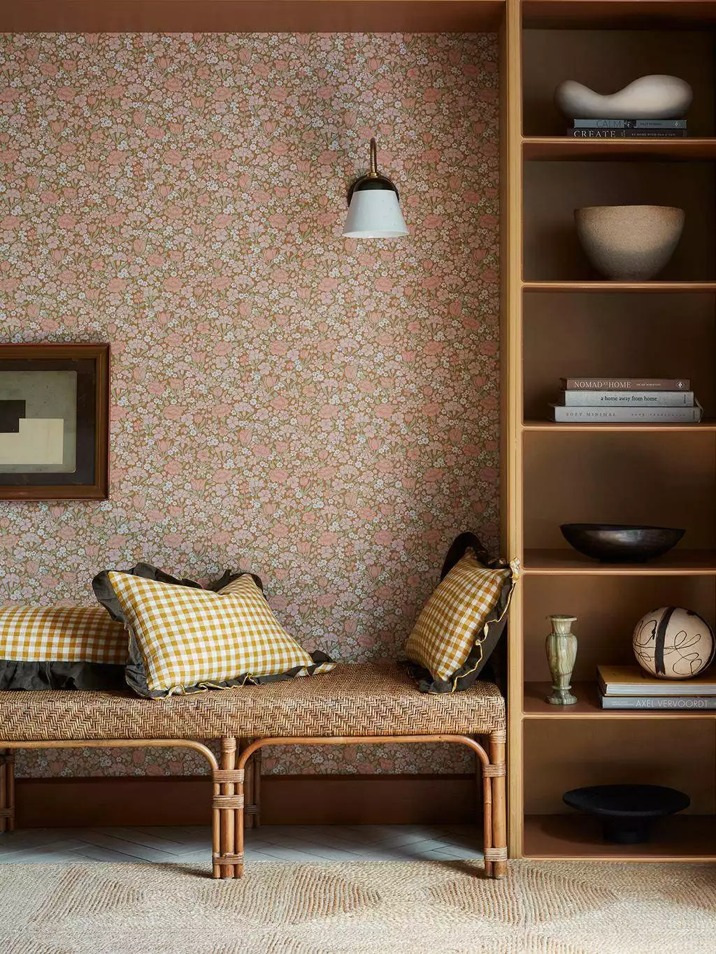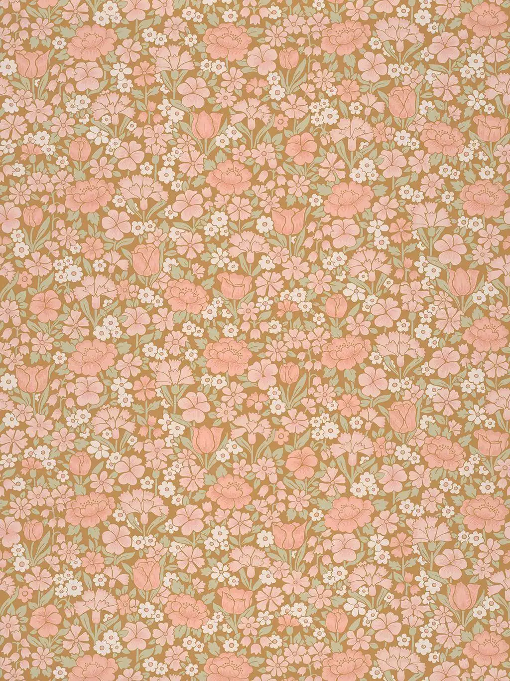 Spring Flowers von Little Greene ist eine florale Designer-Tapete, die die Lust am Muster feiert. Inspiriert von historischen Vorlagen, zeigt sie, wie frühere Designer Blüten und Blätter verdichteten und stilisierten, um die Natur in den Raum zu holen. Die Farbgebung Bombolone bringt das Motiv ins Jetzt: warmes Karamell als Grund, darüber Blüten in pudrigem Rosa, Creme und soften Grüntönen. Die vielen kleinen Formen greifen ineinander, fast wie ein gewebter Teppich aus Frühling. Die Tapete wird im Oberflächendruckverfahren gedruckt. So bleibt die Struktur lebendig und leicht unregelmäßig. Im Raum wirkt die Tapete weich, einladend und überraschend dicht – wie ein stiller, warmer Garten, der sich an die Wand legt.