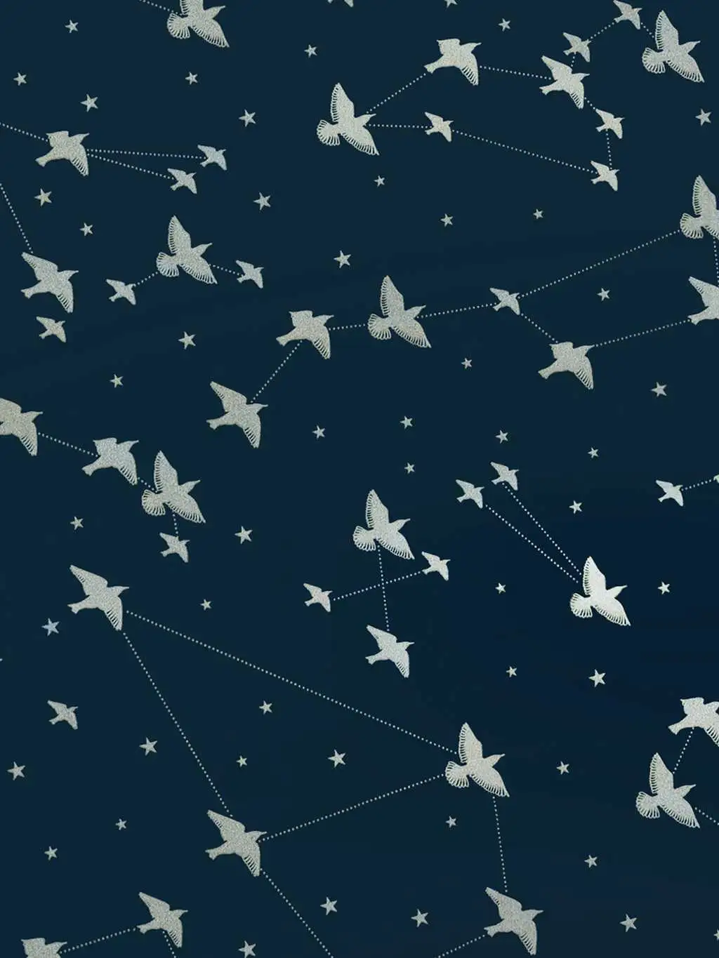 A murmuration of starlings swoop among star constellations, picked out in silver on a midnight sky.