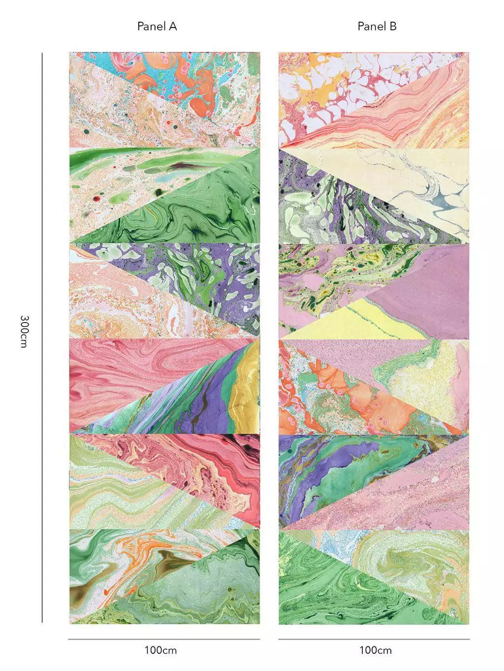Die marmorierten Stücke von Stone Anthology wurden von Natascha in den letzten fünf Jahren aufbewahrt und gehütet. Jedes Stück stammt aus einer früheren Auflage und hat die Erinnerung an das Projekt und den Moment der Entstehung festgehalten. Im Laufe der Zeit hat Natascha diese Einzelstücke sorgfältig kuratiert, ausgewählt und zu größeren Kunstwerken zusammengestellt. Der Kuratierungsprozess beinhaltet die Berücksichtigung verschiedener Faktoren wie visuelle Ästhetik, thematische Farbpaletten und erzählerische Muster.