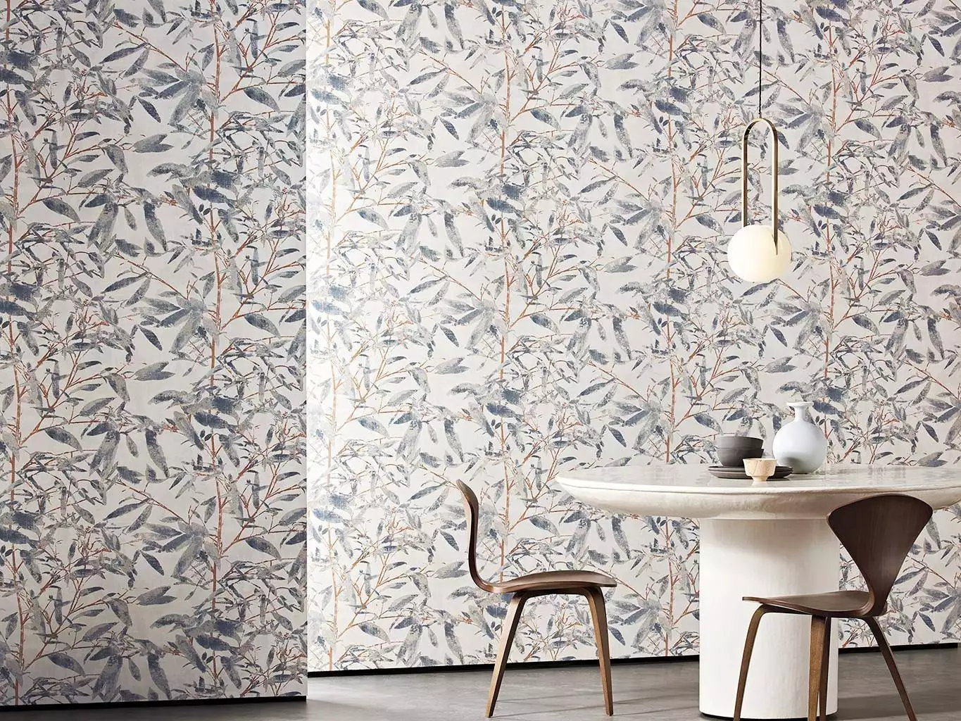 Sumba präsentiert eine faszinierende Darstellung von exotischem Bambus, vereint dabei zarte, malerische Texturen mit metallischen Akzenten. Das Bambusdesign zeigt sich in gedämpften Farbtönen.