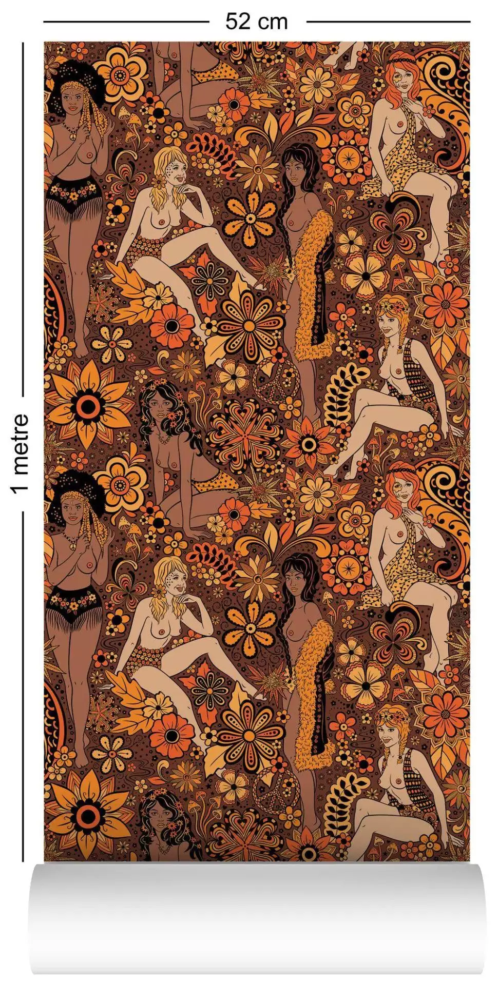 Diese Tapete feiert das Lebensgefühl der späten 60er – psychedelisch, frei und voller Energie. Zwischen opulenten Blütenmustern tauchen sinnliche Figuren auf, die in kräftigen Orange- und Brauntönen mit einem Hauch von Gold inszeniert sind. Das Design ist verspielt, leicht provokant und verströmt die Aura eines wilden, ungezähmten Sommers. „Summer of Love“ ist eine Hommage an Freiheit, Flower Power und die Lust am Anderssein – ein Statement für Räume, die bewusst Charakter zeigen.