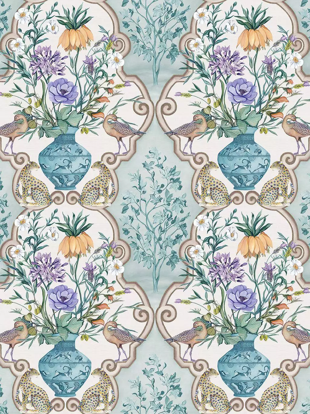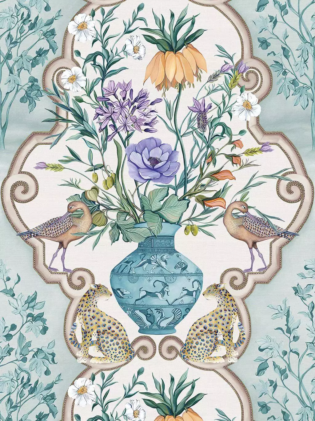 Osborne & Little's Tapete Sundara verbindet Elemente antiker Töpferkunst, zarte Pflanzen und Blüten mit Vögeln und Geparden. Ornamentale Bögen, die ihre Inspiration in Nordafrika und dem Mittelmeer finden, durchziehen das Muster wie rankende Rahmen. Die Farbpalette verbindet Luxus mit natürlicher Eleganz – ideal für Räume mit botanischem Flair.