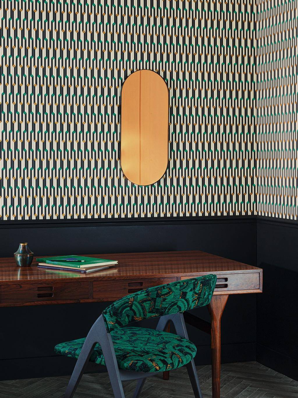 Die Tapete Suzanne hat im namengebenden Emerald eine beeindruckende Präsenz. Das kräftige Grün, die goldenen Linien und die klar gesetzten Formen entfalten an der Wand eine enorme Wirkung, die man nicht übersieht. Das Motiv erinnert an die opulente Geometrie des Art Déco und wirkt zugleich modern und luxuriös. Suzanne ist eine Tapete, die einen Raum nicht flankiert, sondern gestaltet – mit Stil, Kraft und einem Hauch Drama.