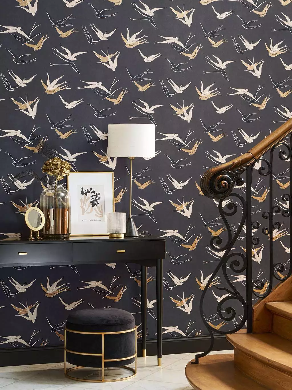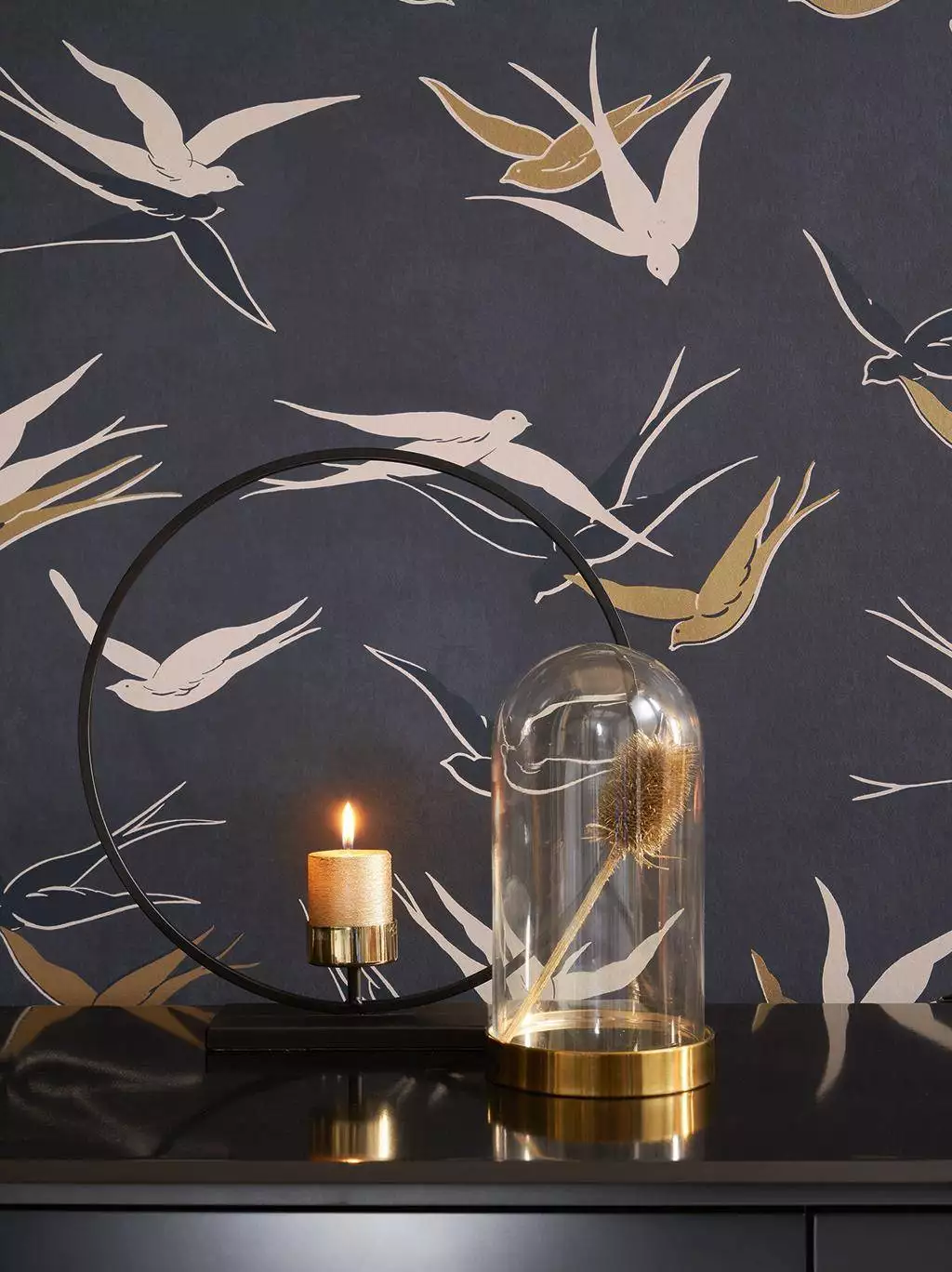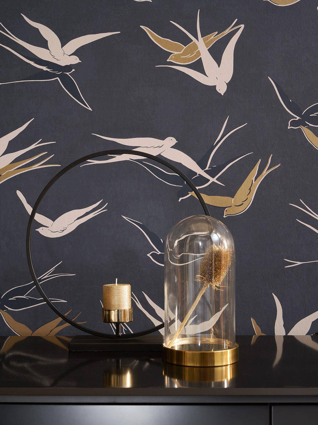 Elegante Boten des Sommers. Die Schwalben in gold und creme wirken auf dem dunklen Untergrund dieser Tapete besonders edel. Mit der Tapete Swallow, nior reglisse bringen Sie Bewegung und Eleganz in Ihre Räume. Die hochwertige Vliestapete aus dem französischen Design-Haus Casadeco kommt ganz im Stil der 1920er Jahre daher. Atemberaubend schöne Schwalben fliegen hier in kleinen Gruppen über einen dunklen Hintergrund. Die edlen Vögel mit ihren ausgebreiteten Schwingen wirken in den Tönen Gold, Creme und Schwarz sehr luxuriös. Leichtes Changieren bei Lichteinfall macht den stilisierten Druck lebendig und äußerst edel. Fast möchte man mit ihnen fliegen. Die Tapete Swallow aus der Twenties-Kollektion passt hervorragend in stilvoll eingerichtete Wohnräume mit Art déco-Einschlag oder auch in Jugendstil-Zimmer. Ganz besonders wirkungsvoll wirkt die leicht zu verarbeitenden Tapete in einer eklektischen Einrichtung, einem Mix aus Altem und Neuen. Im Esszimmer, Wohnzimmer, Arbeitszimmer, Schlafzimmer oder auch im Eingangsbereich – diese Schwalben ziehen den Betrachter in jedem Raum in Ihren Bann.