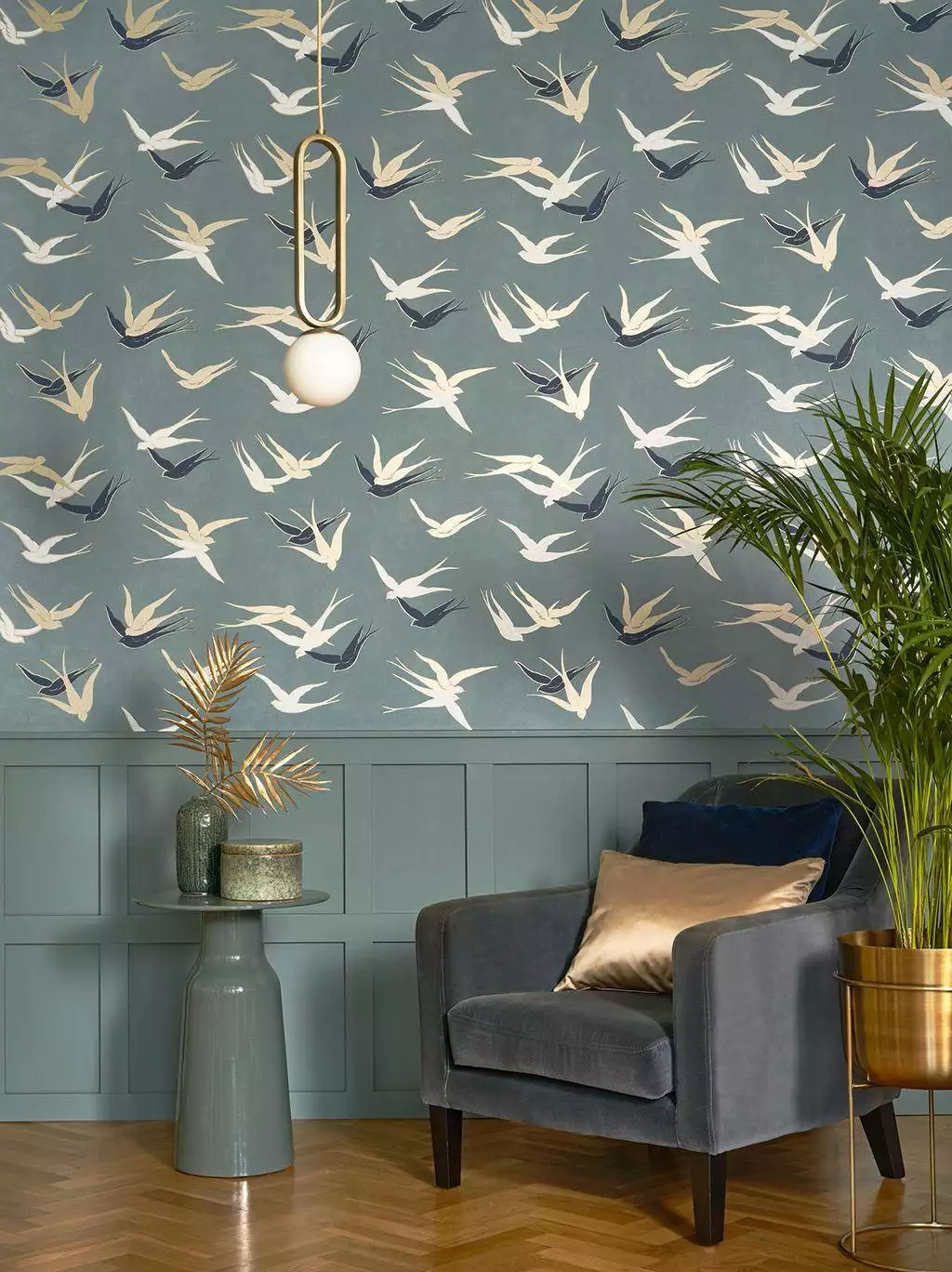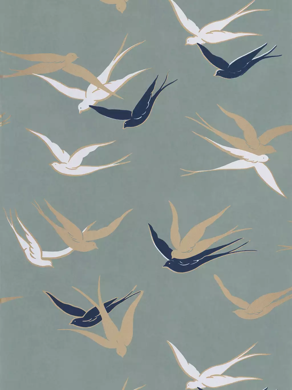 Die Swallow, vert sauge Tapete verleiht Räumen eine elegante Leichtigkeit. Vor einem sanften Salbeigrün-Hintergrund fliegen stilisierte Schwalben in Creme, Gold und Dunkelblau, die eine harmonische, poetische Atmosphäre schaffen. Das Design vermittelt ein Gefühl von Freiheit und Bewegung, während die dezente Farbpalette eine beruhigende, zeitlose Eleganz ausstrahlt.