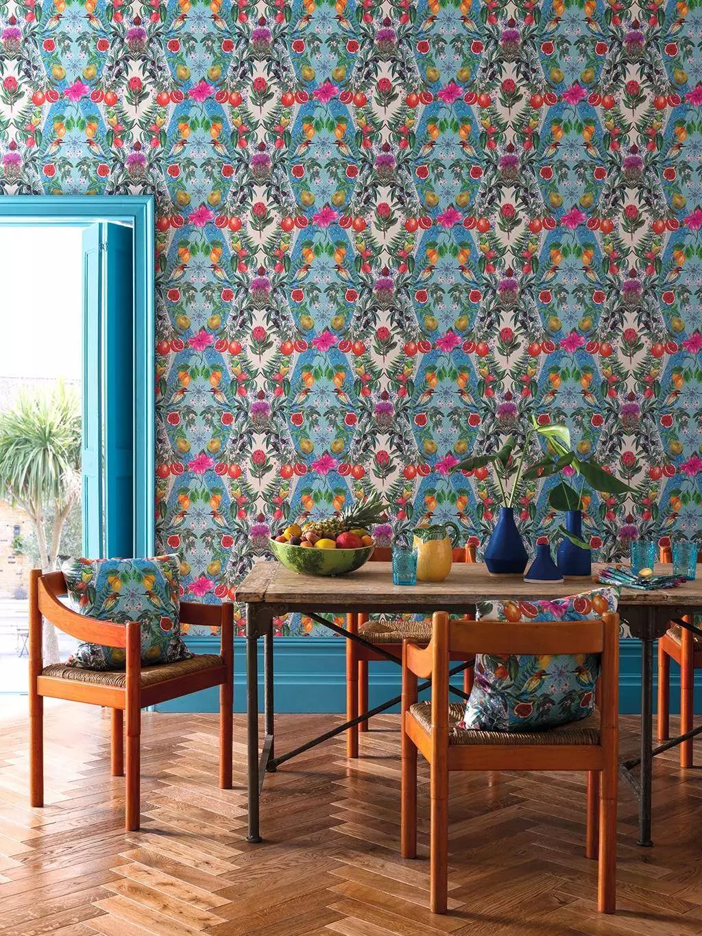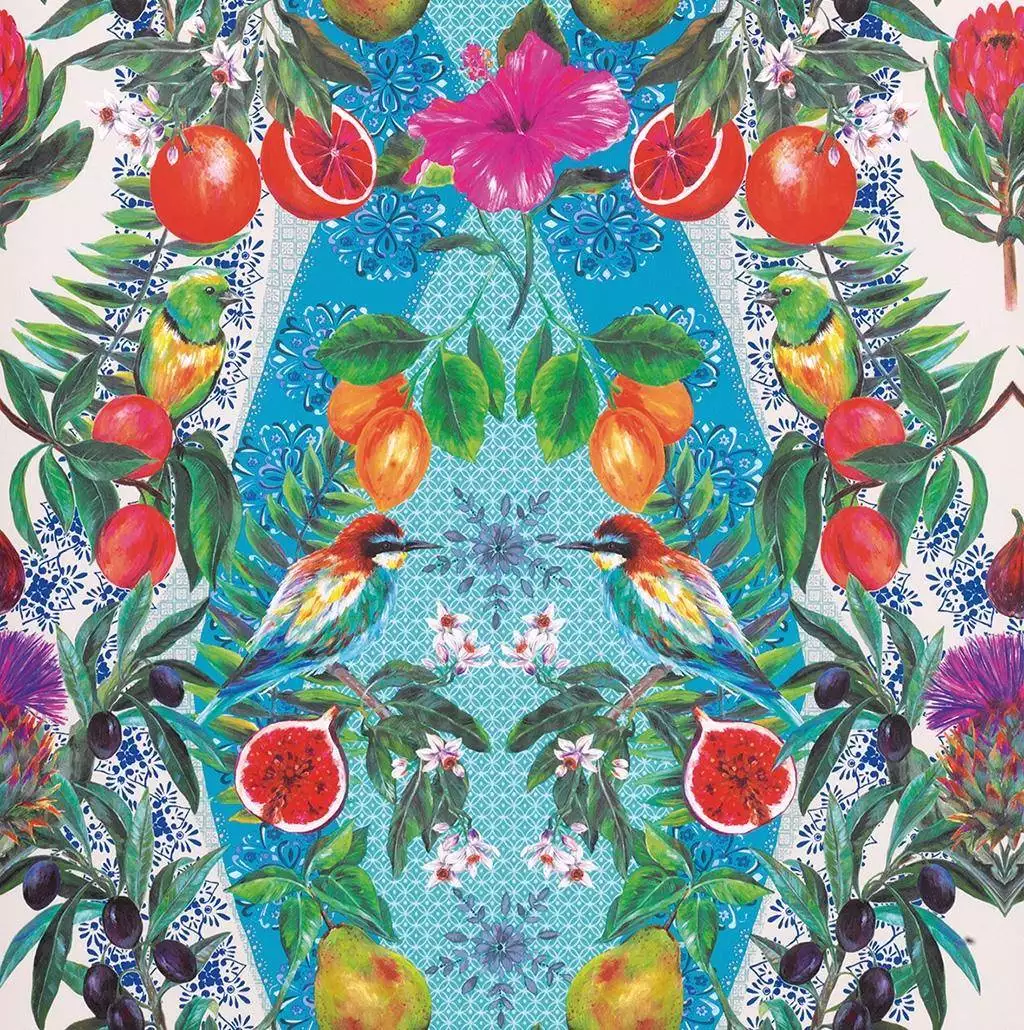 Die "Talavera" Tapete ist ein Fest für die Sinne – lebendige Farben und exotische Motive verschmelzen zu einem kaleidoskopischen Design. Tropische Früchte, üppige Blüten und Vögel erzeugen eine fröhliche, mediterrane Atmosphäre. Perfekt für Räume, die Lebendigkeit und einen Hauch von Urlaub ausstrahlen sollen. Ein echtes Statement-Piece!