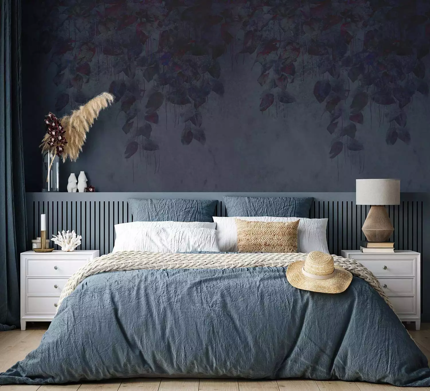 Die Tapete Talbots Calotype von Elli Popp bringt Tiefe und Ruhe in den Raum. Dunkles Blau trifft auf ein zartes Blättermuster. Die Farben wirken wie verblasste Naturaufnahmen – in Indigo, Violett, Grau und Burgunderrot. Das Design erinnert an historische Fototechnik. Es schafft eine stimmungsvolle, elegante Atmosphäre. Ideal für Schlafzimmer, Wohnzimmer und Boutique-Hotels. Passt zu dunklen Holztönen, Naturmaterialien und neutralen Farben.