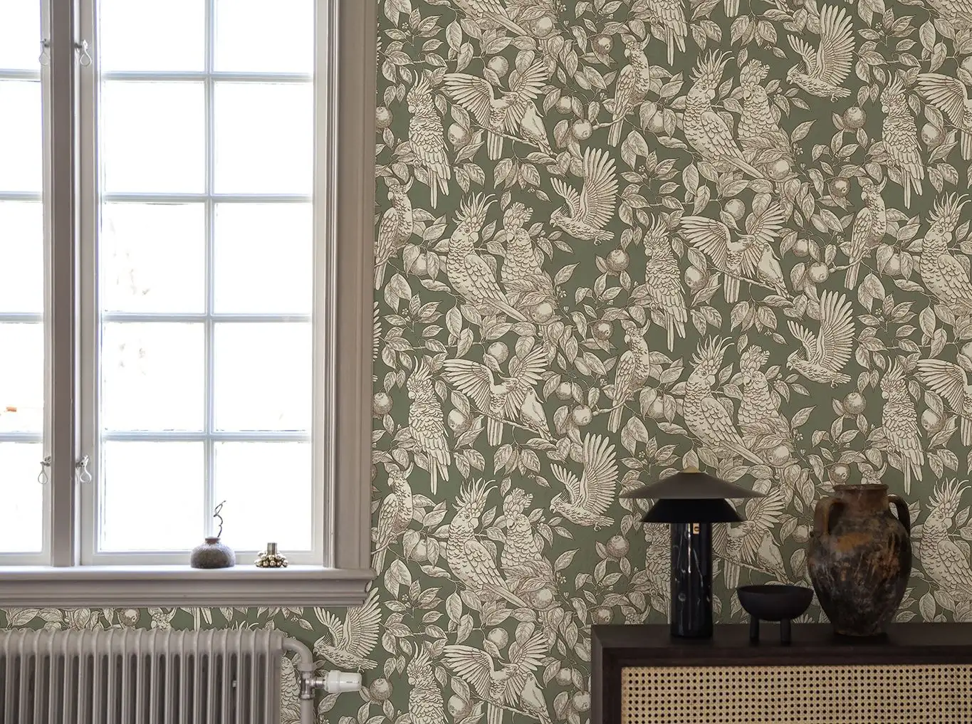 Die Tapete "Talk about cockatoos“ beschreibt die eine Märchenwelt der Designerin Emma von Brömssen. Der Stil ist von traditionellen Toile de Jouy Mustern inspiriert hat aber seinen eigenen modernen Touch.