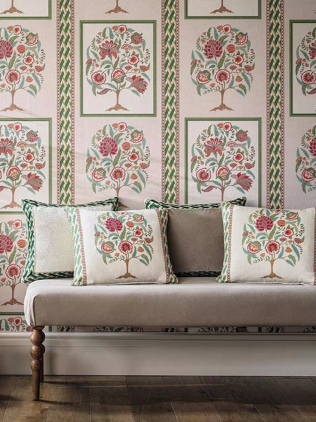 Die "Taniska, col. 01" Tapete besticht durch ihr traditionelles, symmetrisches Design. Dekorative Lebensbäume in sattem Rot und Grün auf einem hellen Hintergrund bringen zeitlose Eleganz und indischen Charme in den Raum. Perfekt für stilvolle Wohnbereiche, verleiht sie Wärme, Balance und eine kunstvolle, klassische Note.