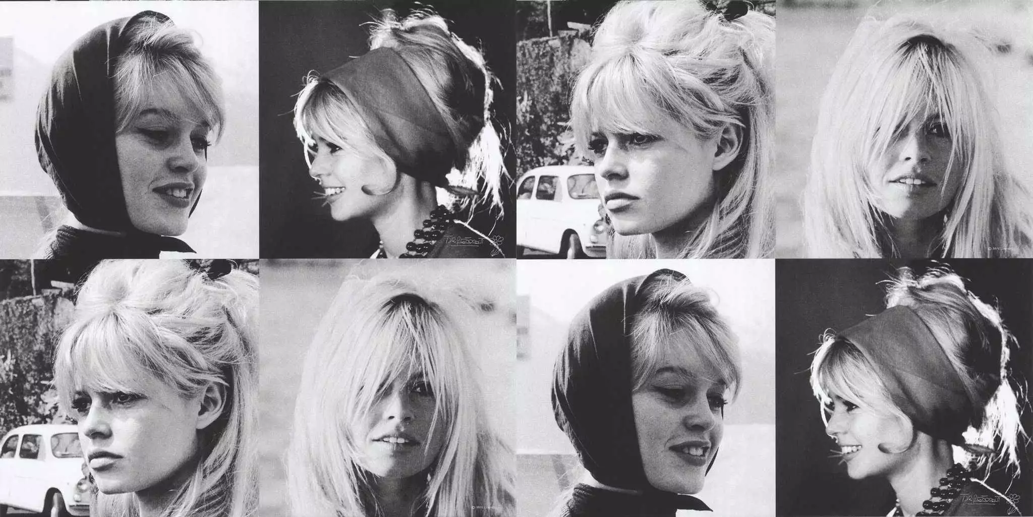 Brigitte Bardot Tapete – Stilvolle Retro-Wandgestaltung. Diese Vliestapete zeigt eine schwarz-weiße Fotocollage von Brigitte Bardot. Das Design verleiht Räumen eine nostalgische Note und passt zu modernen sowie klassischen Einrichtungen.