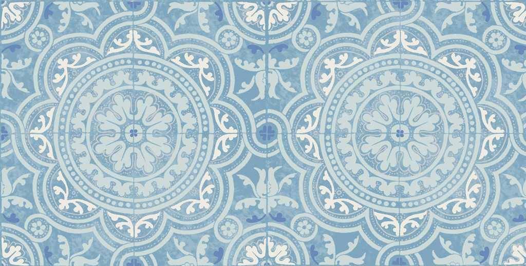 Die Tapete Piccadilly, col. 02 ist von ornamentalen Fliesenmustern inspiriert, wie man sie in historischen Bahnhöfen, viktorianischen Gebäuden oder mediterranen Innenhöfen findet. In feinen Blautönen entfalten sich symmetrische Medaillons und florale Arabesken, die in ihrer Wiederholung eine ruhige, zugleich prächtige Wirkung erzeugen. Das Spiel aus Kreisformen, zarten Ranken und klaren Linien vermittelt Struktur und dekorative Fülle – eine Gestaltung, die sowohl an handgemalte Keramik als auch an klassische Architekturdetails erinnert.