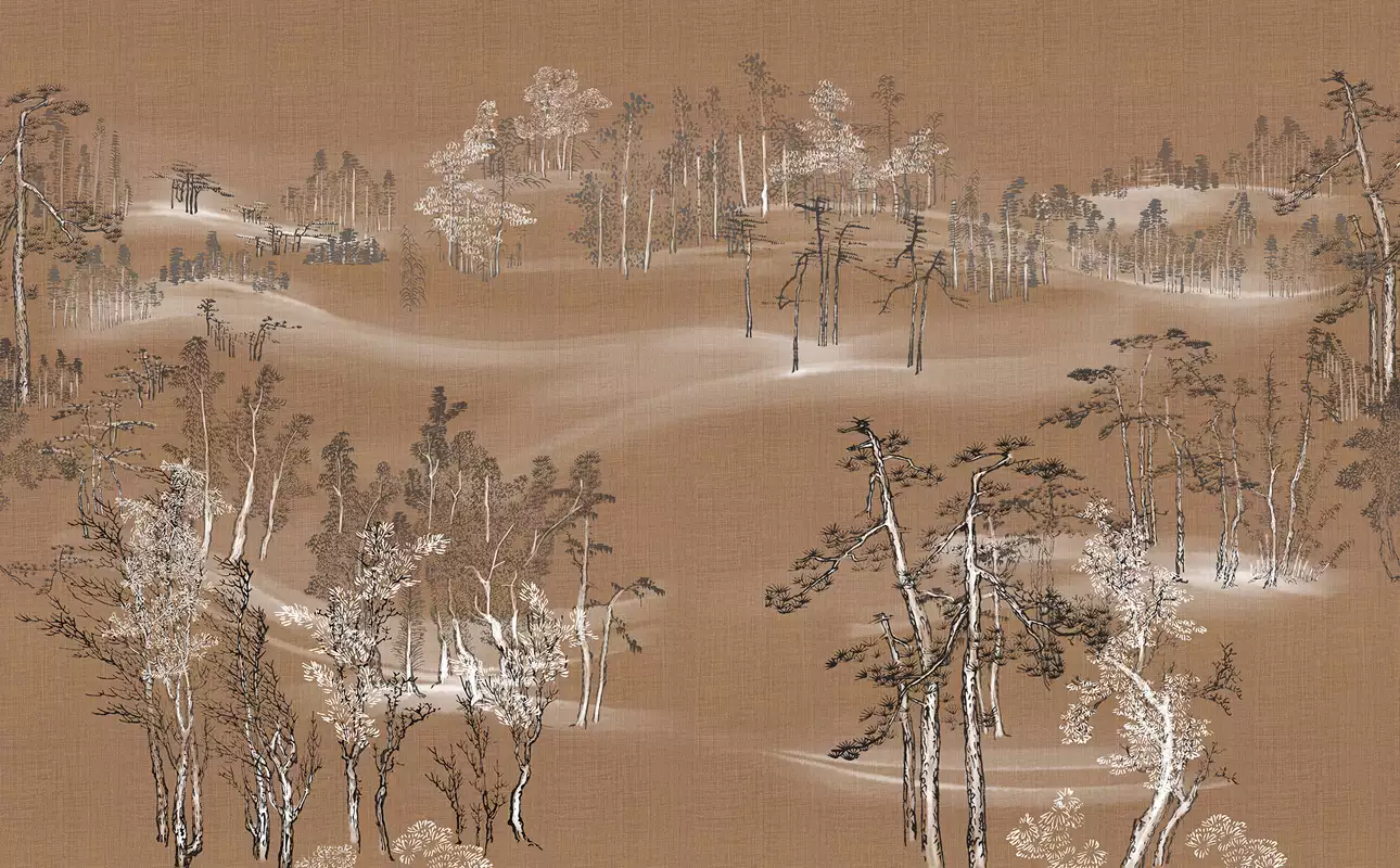 Diese Tapete zeigt eine asiatische Landschaft mit ihren landestypischen Bäumen