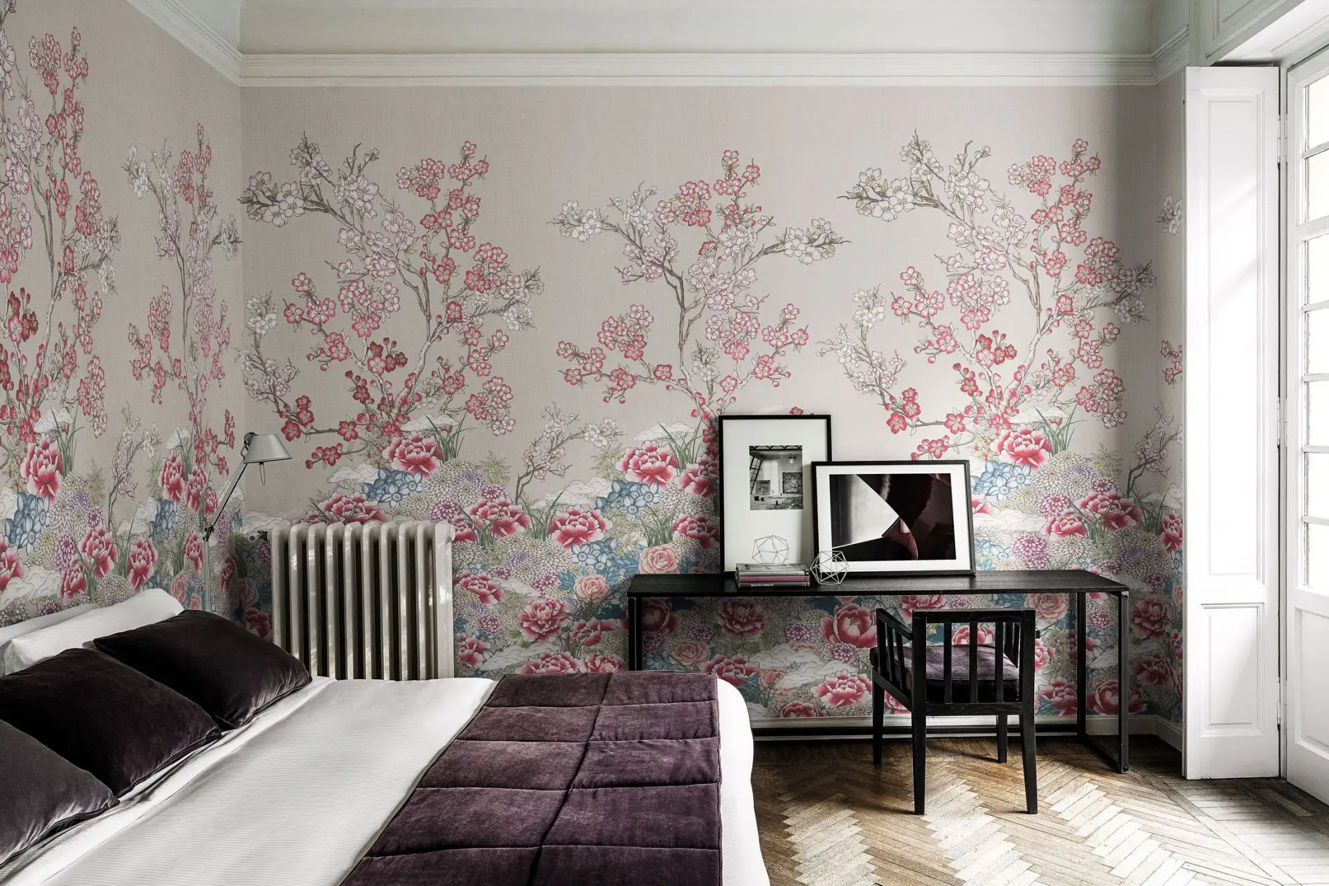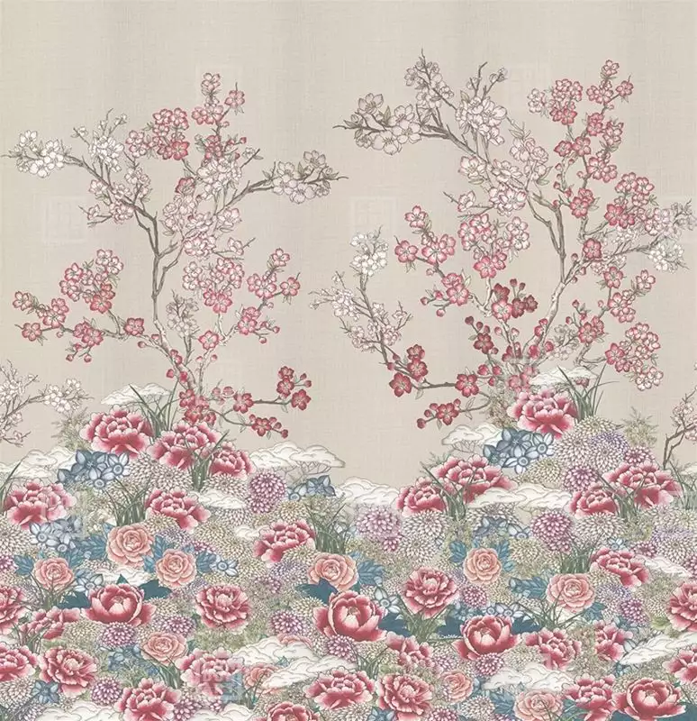 Handgezeichneten Blumen - Kirschen, Kamelien, Pfingstrosen, die in der asiatischen Tradition sehr verankert sind und eine starke symbolische Bedeutung haben, beleben dieses Tapete.