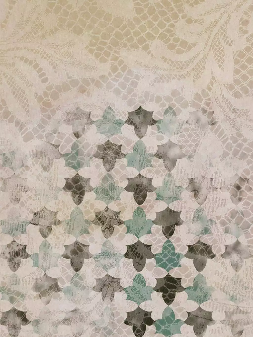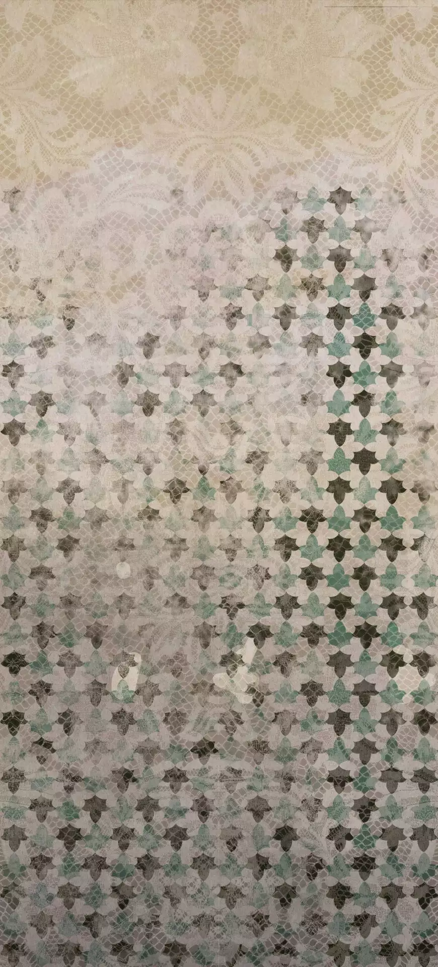 Die Tapete Tessello verbindet zarte Spitze mit alten Kacheln und verzaubert uns in eine andere Zeit, tief in den Süden Spaniens. Eine Tapete für wunderbare Tagträume.