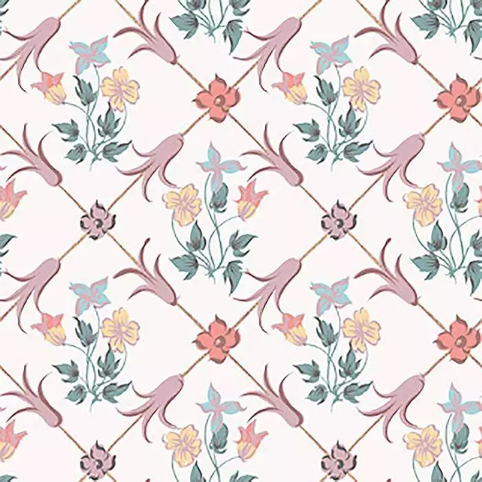 Die zarten floralen Elemente sind symmetrisch angeordnet und erzeugen auf diese Weise eine ruhige Atmosphäre im Raum. Bringen Sie ein nostalgischen Flair in Ihr Zuhause. Als Kontrast eignet sich die Tapete hervorragend für die Wandgestaltung eines Raumes mit einer Einrichtung im Bauernhaus-Stil, ergänzt aber auch auf individuelle Weise eine moderne und zeitlose Art der Einrichtung und Dekoration.